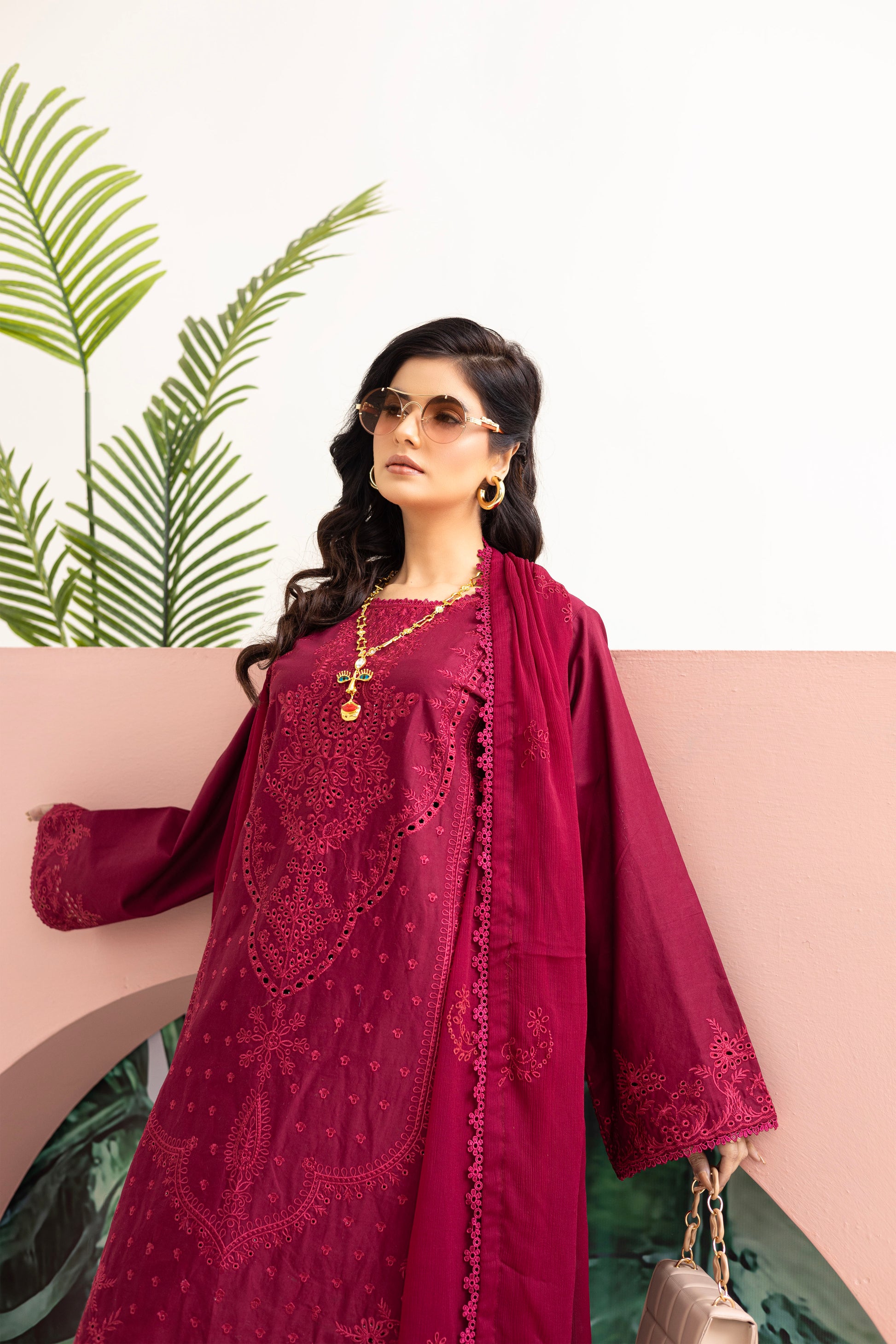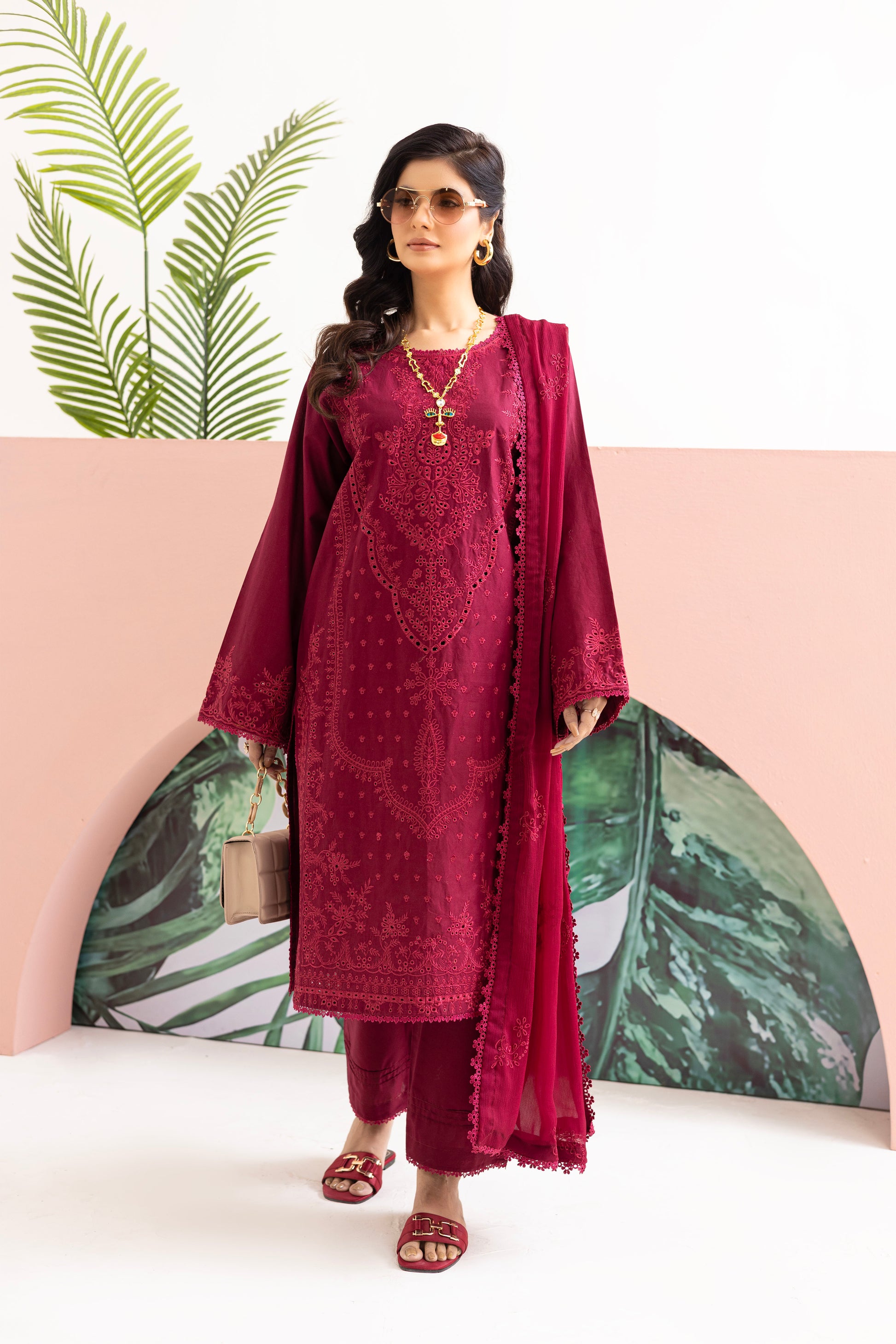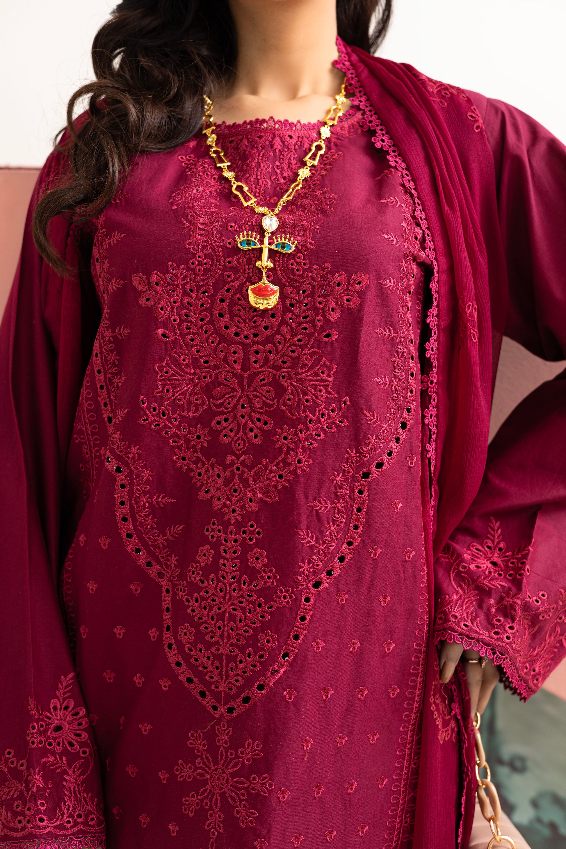 Embroidered shirt with intricate Croatia lace detailing on both the daman and sleeves border, complimented by a matching pair of cotton trouser featuring delicate Croatia lace. Complete the look with a chiffon dupatta adorned with Croatia lace on all four sides.