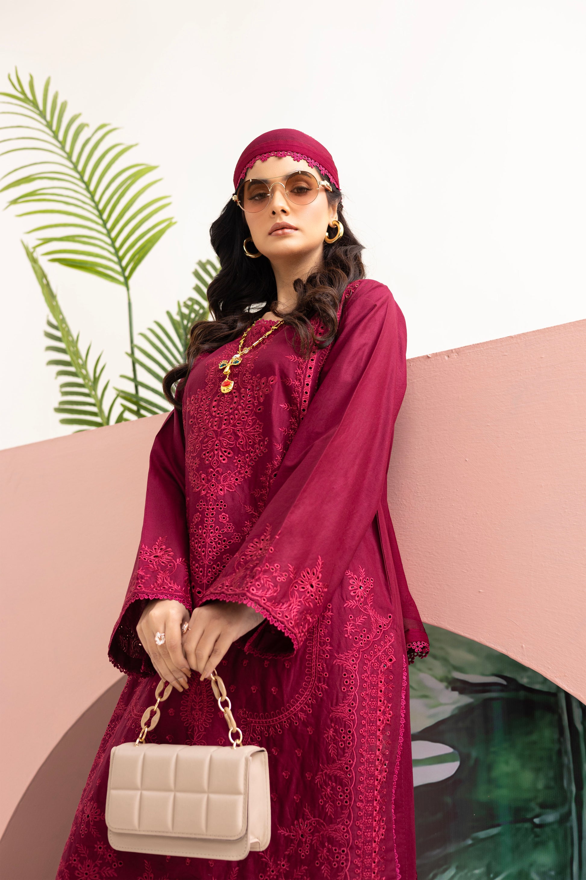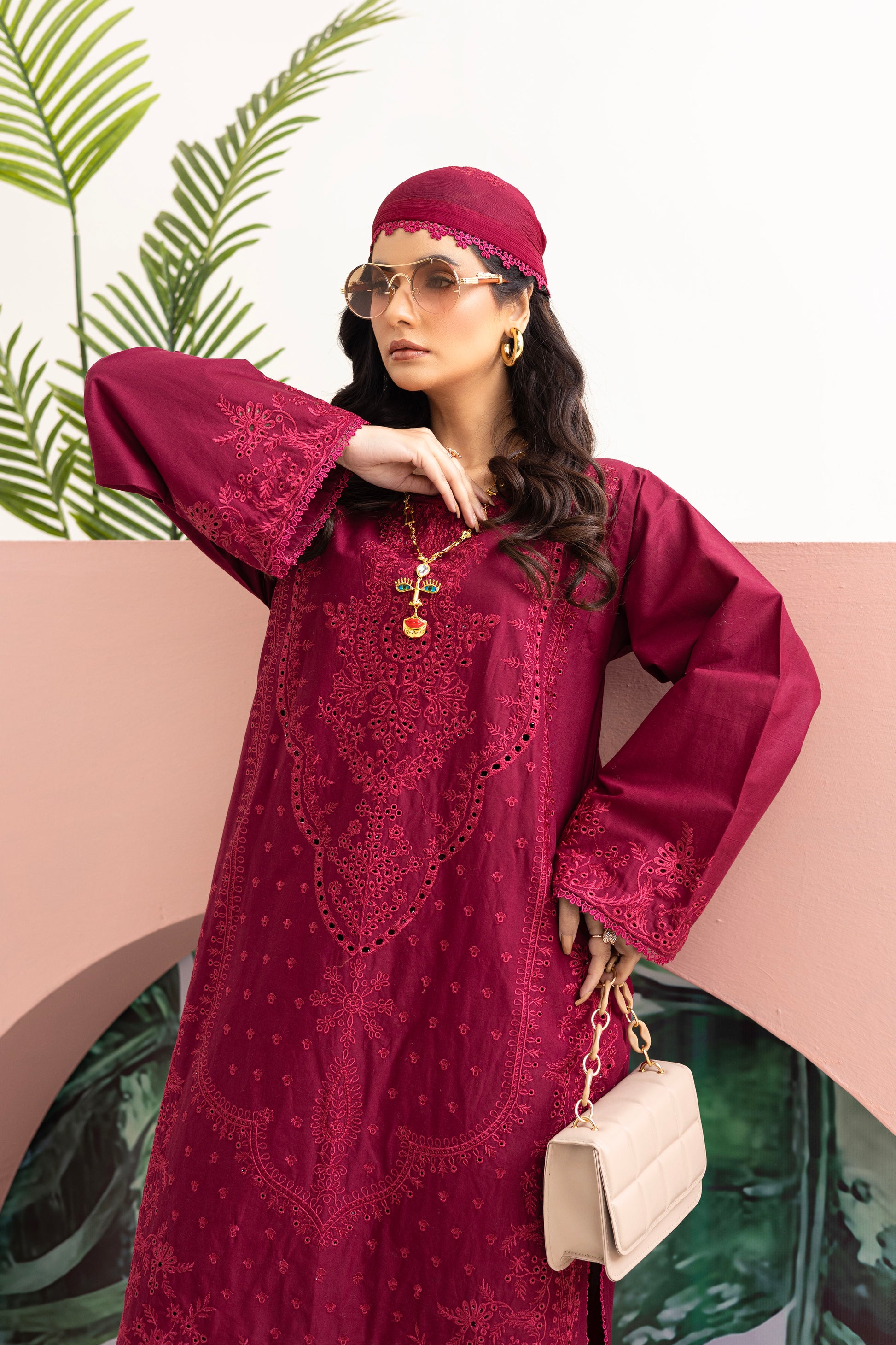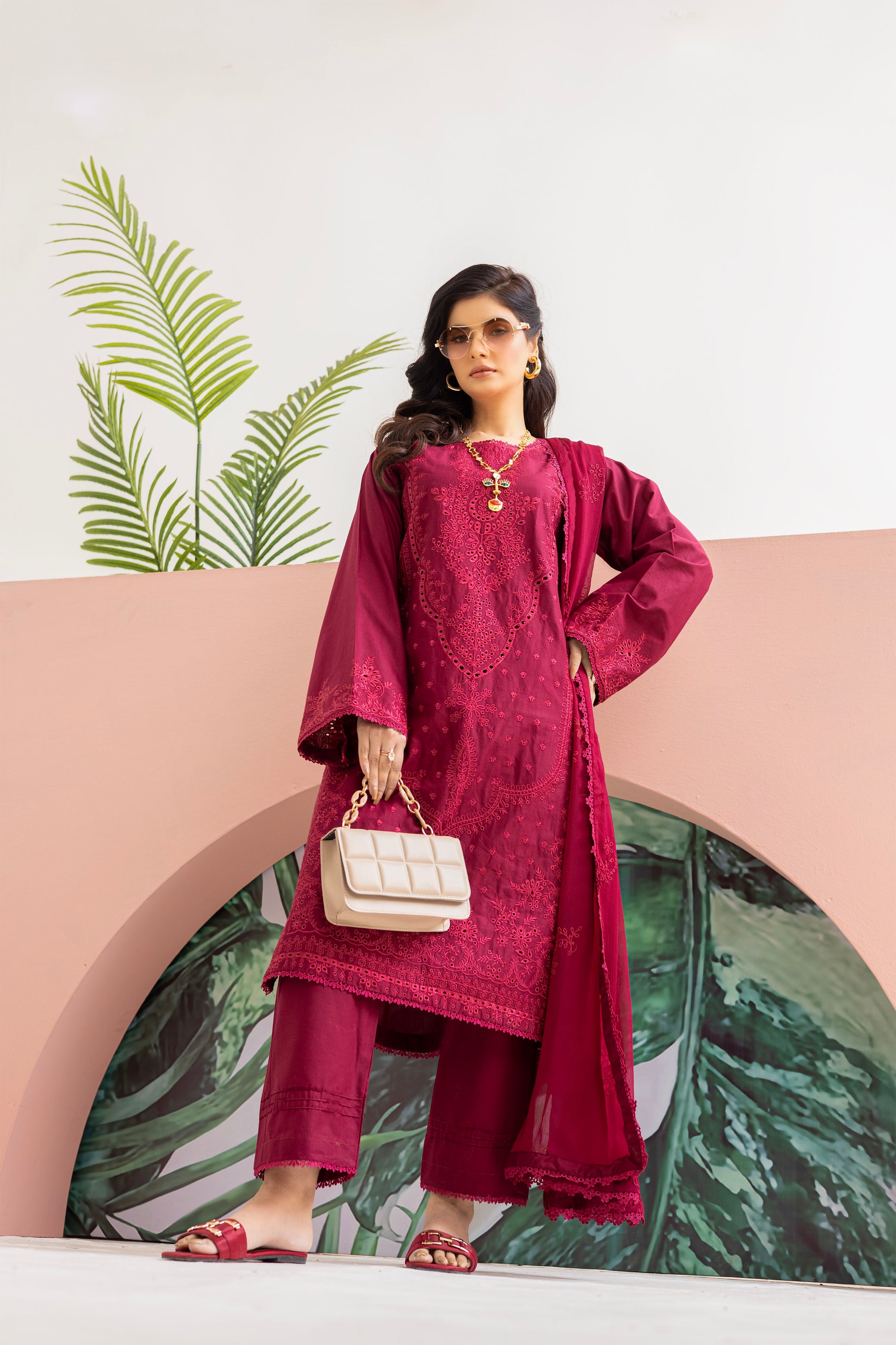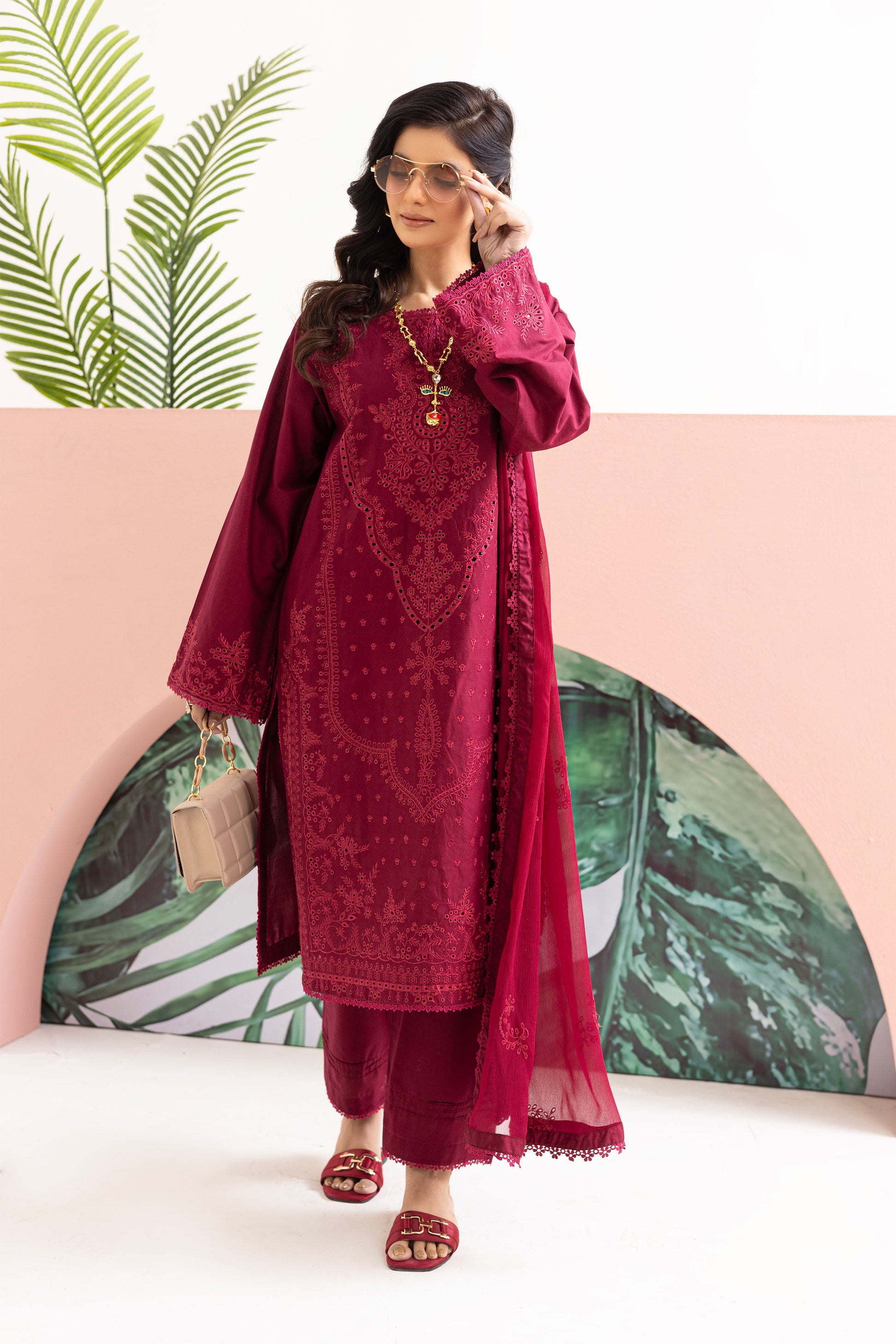 Embroidered shirt with intricate Croatia lace detailing on both the daman and sleeves border, complimented by a matching pair of cotton trouser featuring delicate Croatia lace. Complete the look with a chiffon dupatta adorned with Croatia lace on all four sides.