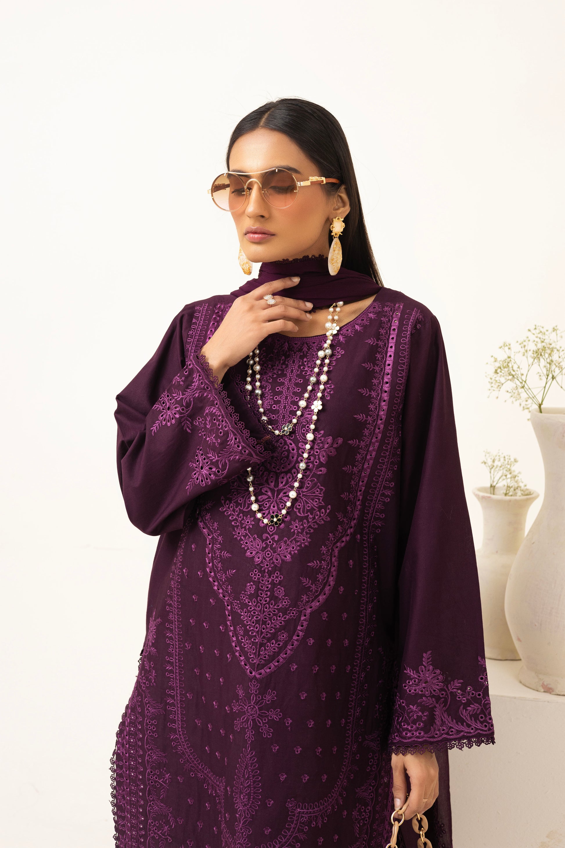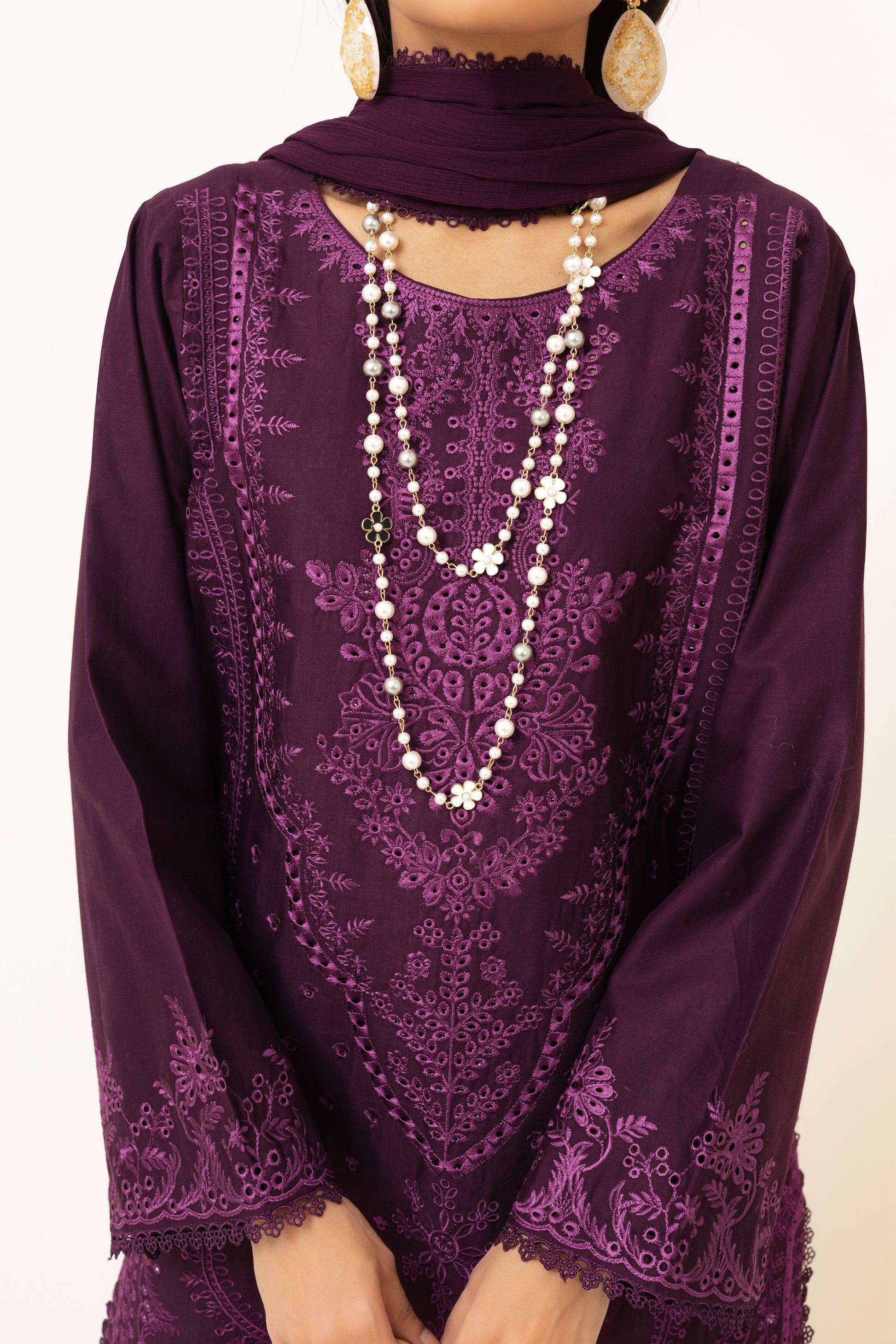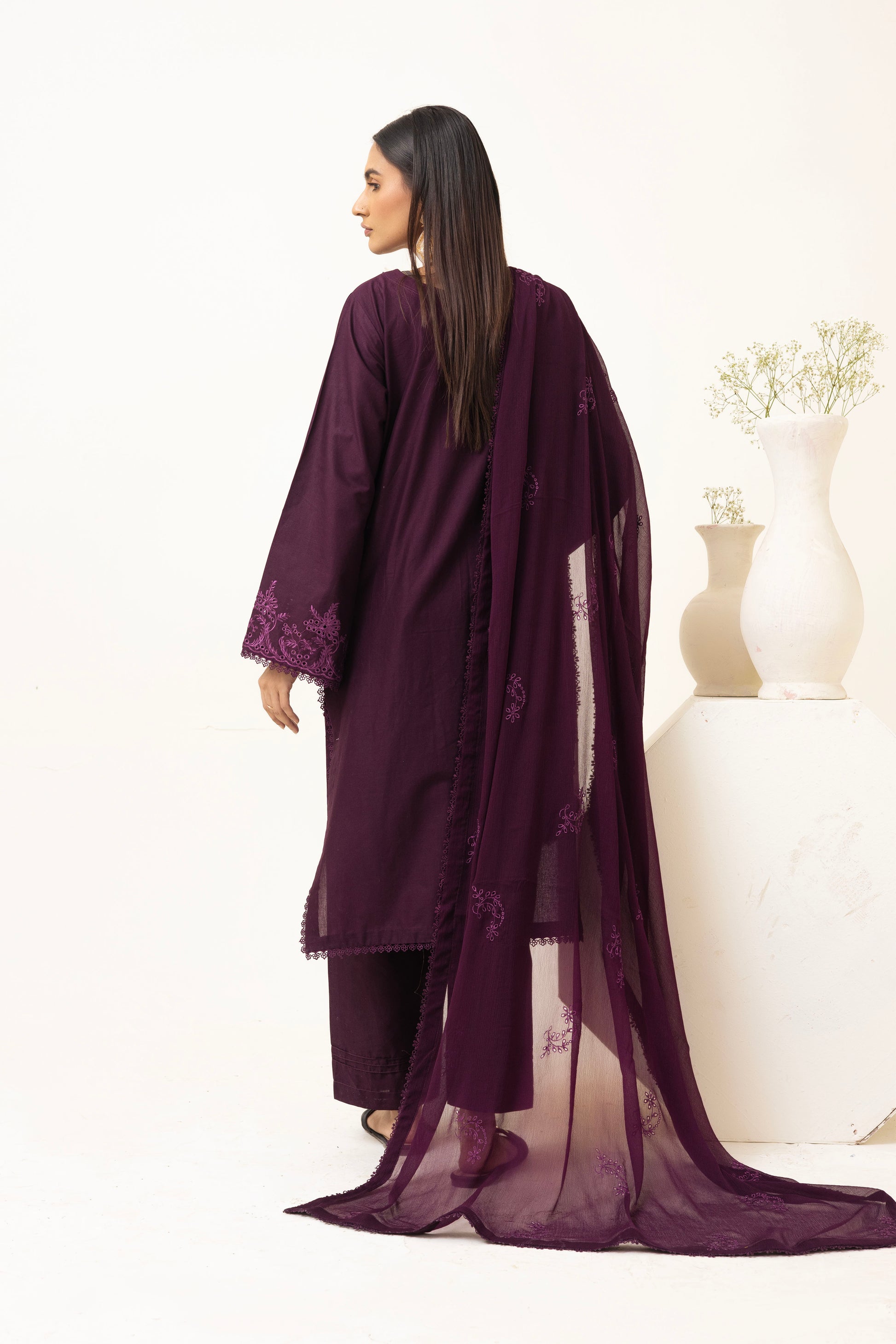 Embroidered shirt with intricate Croatia lace detailing on both the daman and sleeves border, complimented by a matching pair of cotton trousers featuring delicate Croatia lace. Complete the look with a chiffon dupatta adorned with Croatia lace on all four sides.