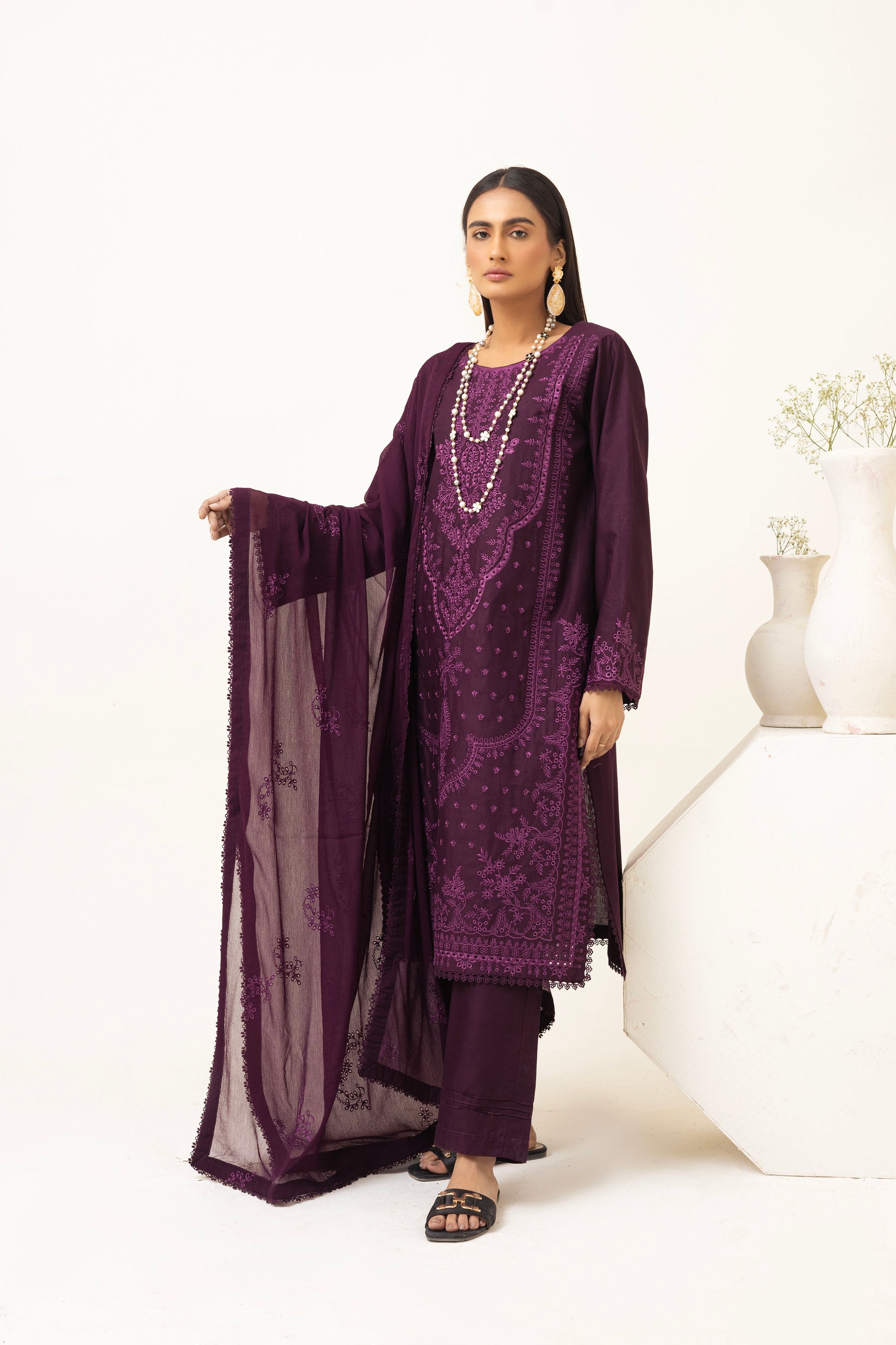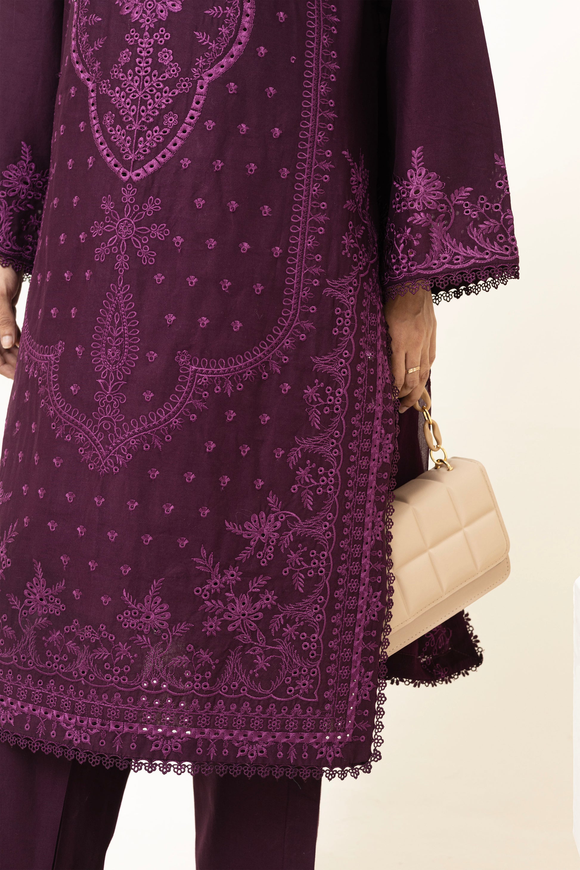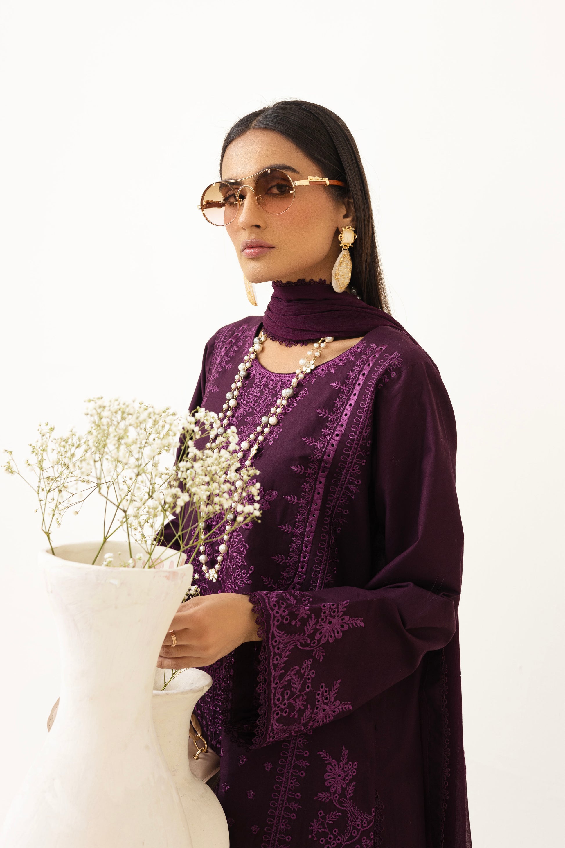Embroidered shirt with intricate Croatia lace detailing on both the daman and sleeves border, complimented by a matching pair of cotton trousers featuring delicate Croatia lace. Complete the look with a chiffon dupatta adorned with Croatia lace on all four sides.