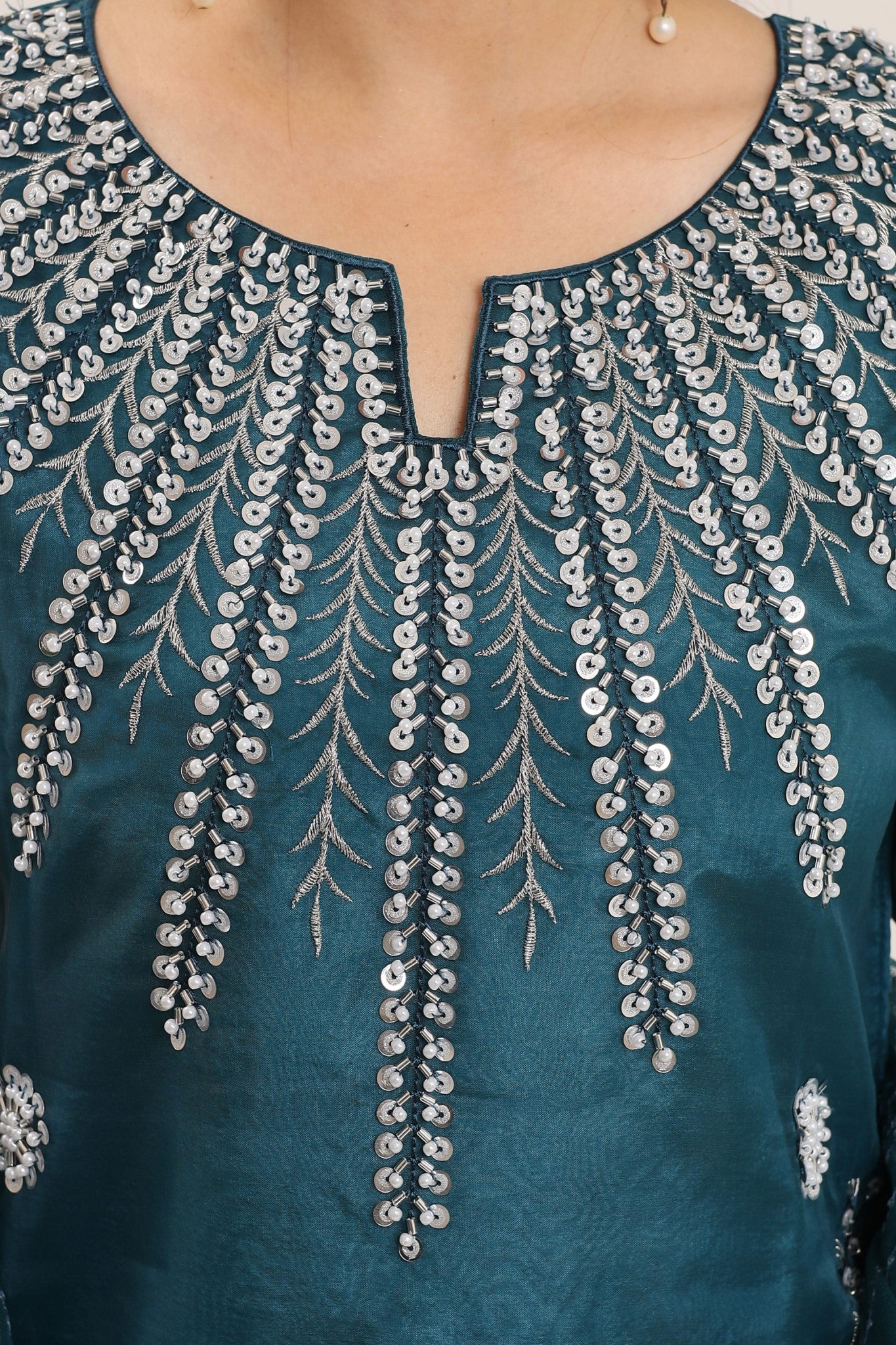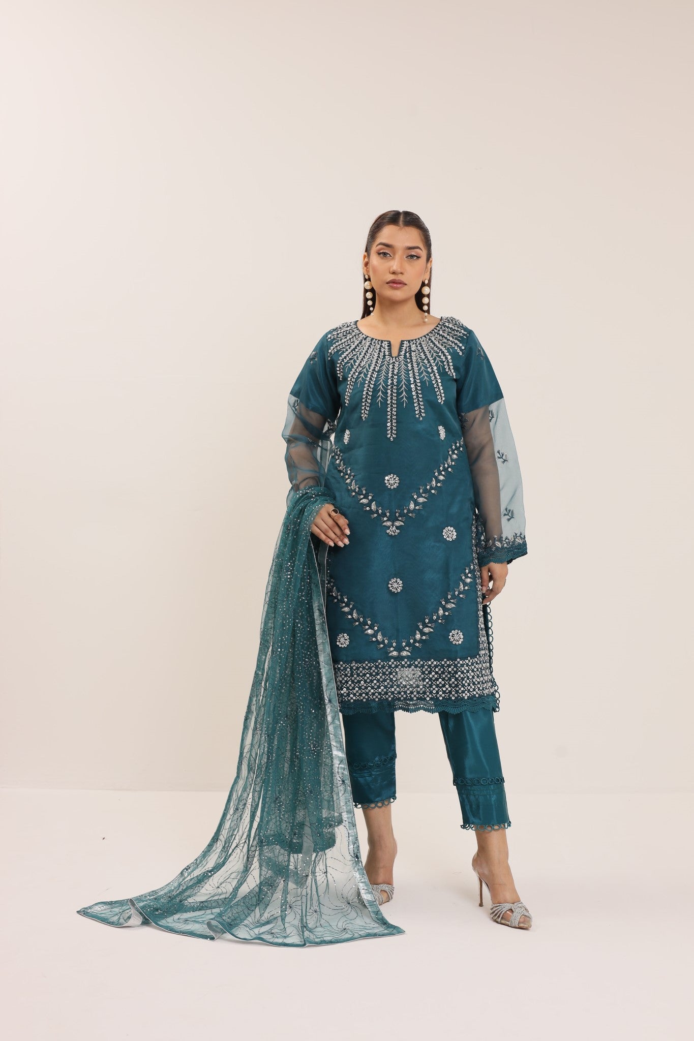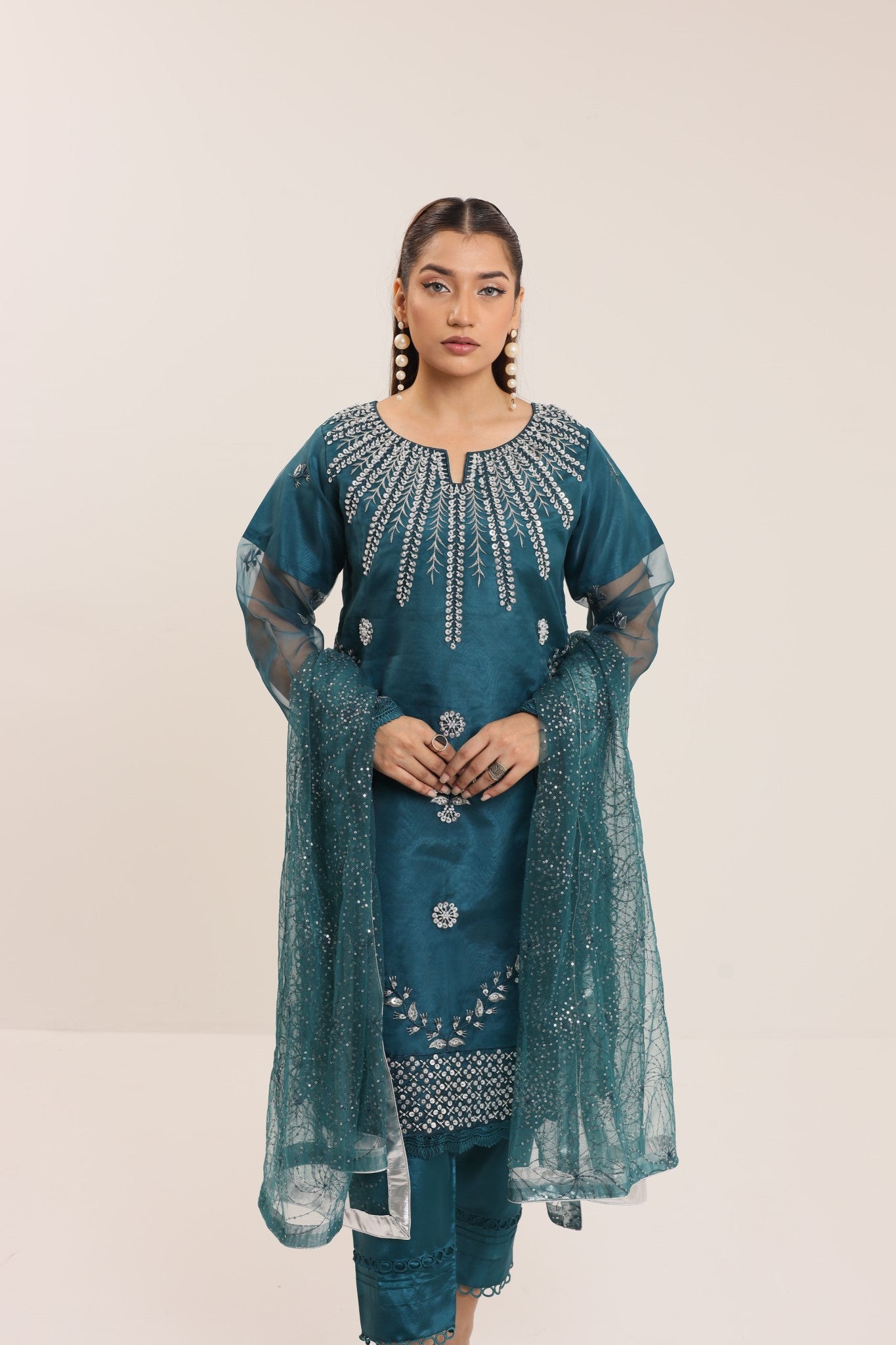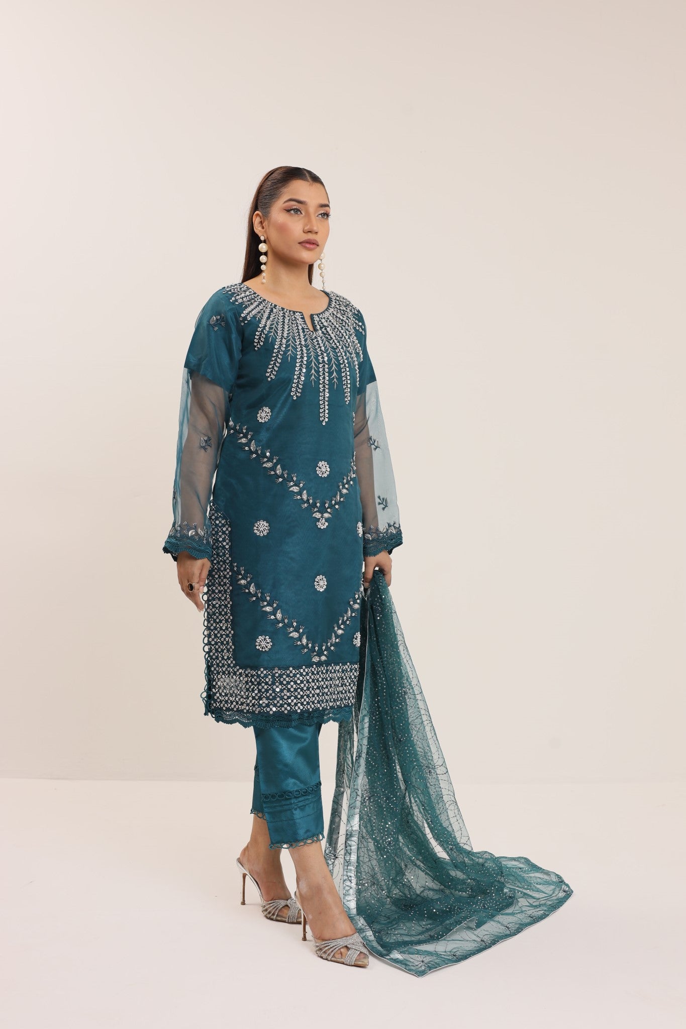 Elevate your style with Machine Embellishments/ Embroideries in pure Organza jet black attire with intricate ensemble in sequins net Dupatta.