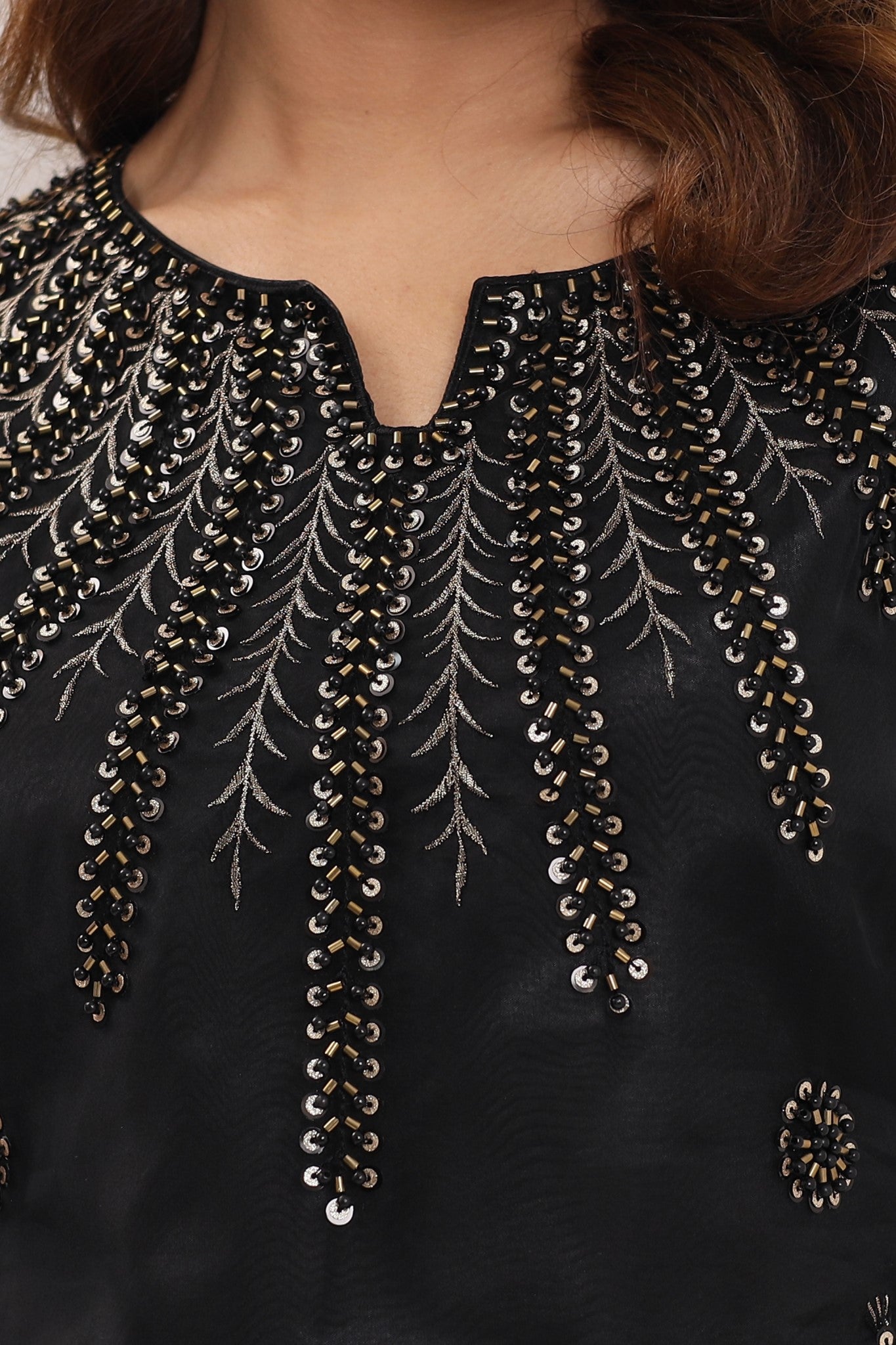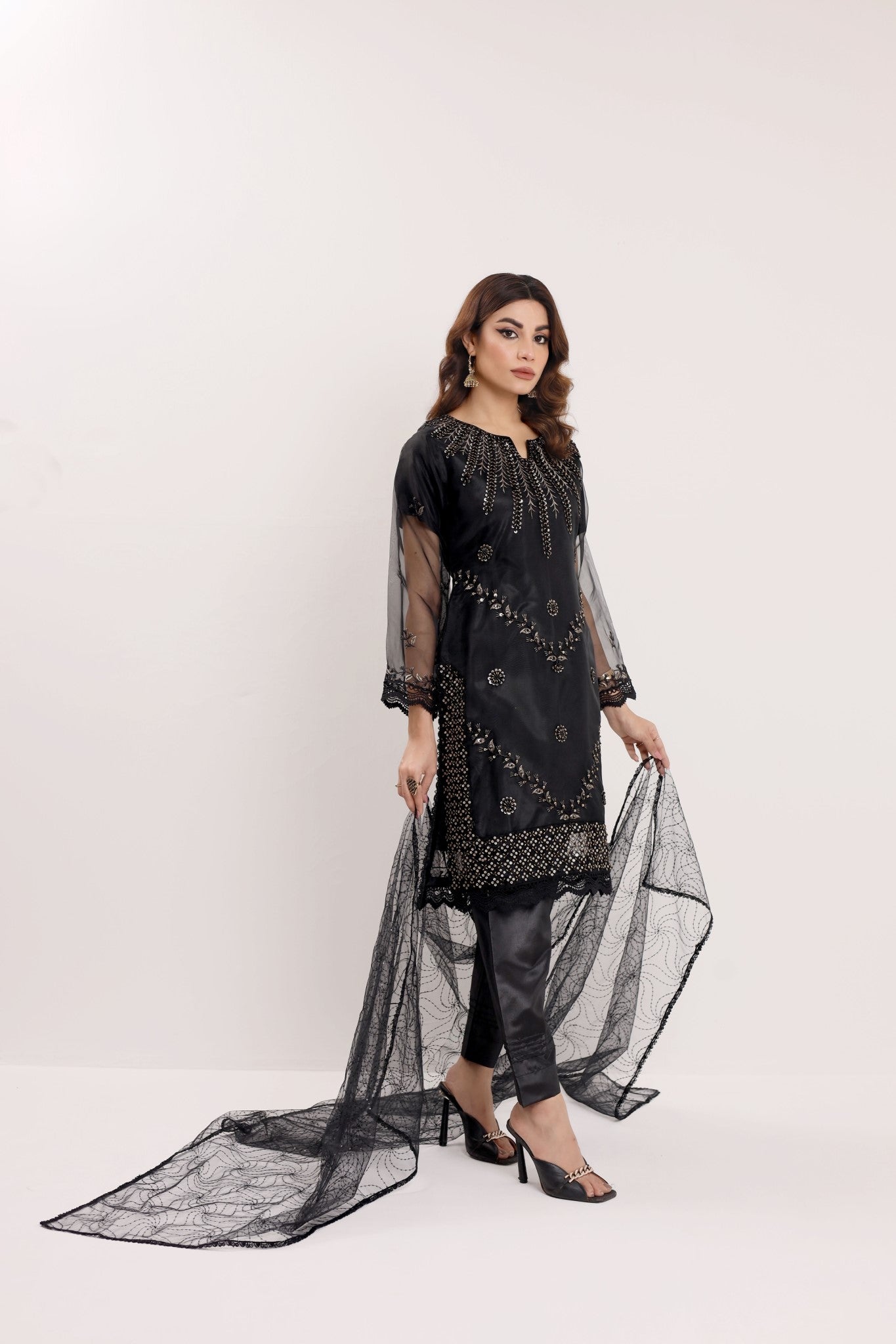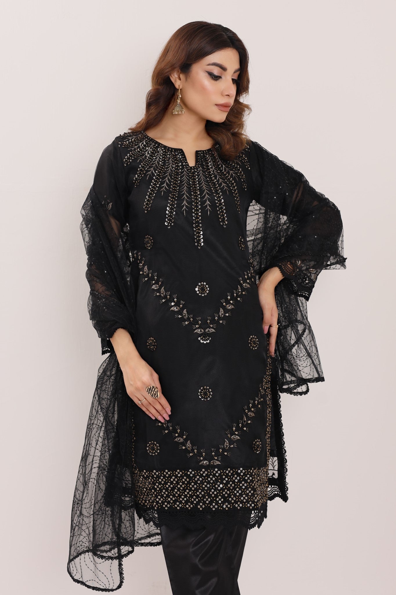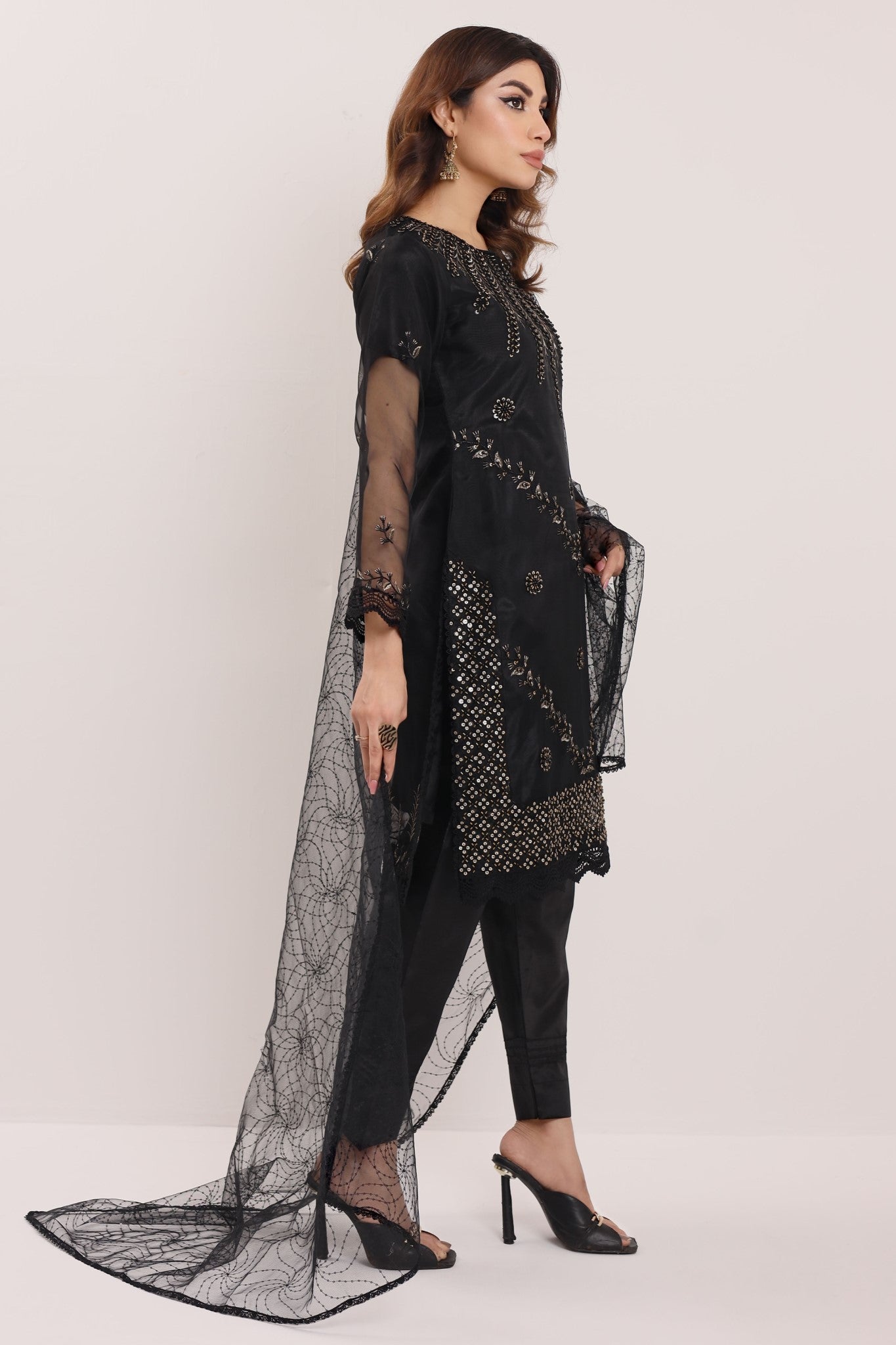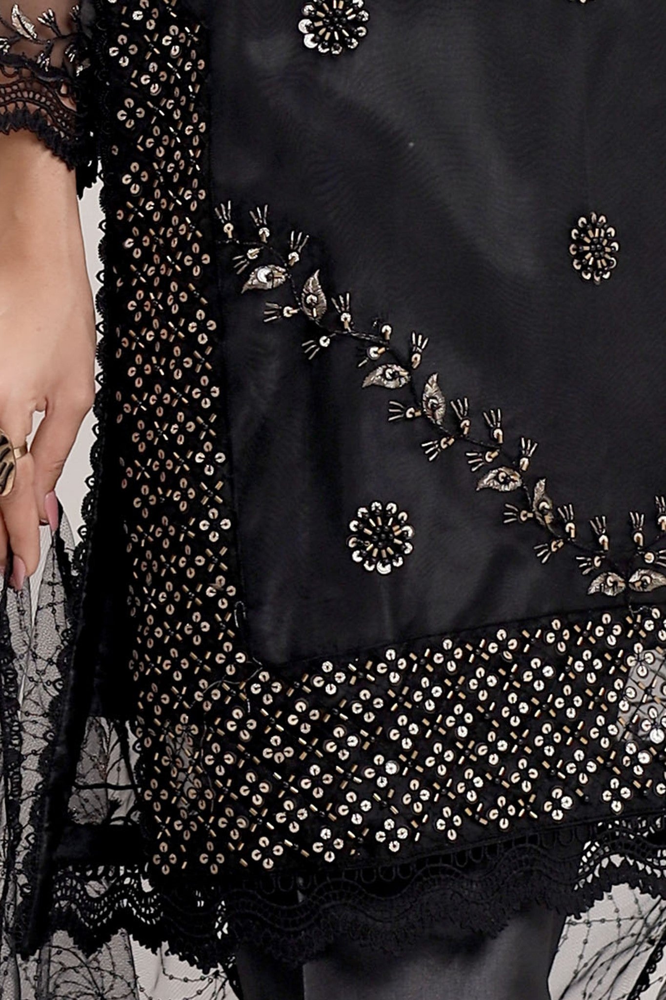Elevate your style with Machine Embellishments/ Embroideries in pure Organza jet black attire with intricate ensemble in sequins net Dupatta.