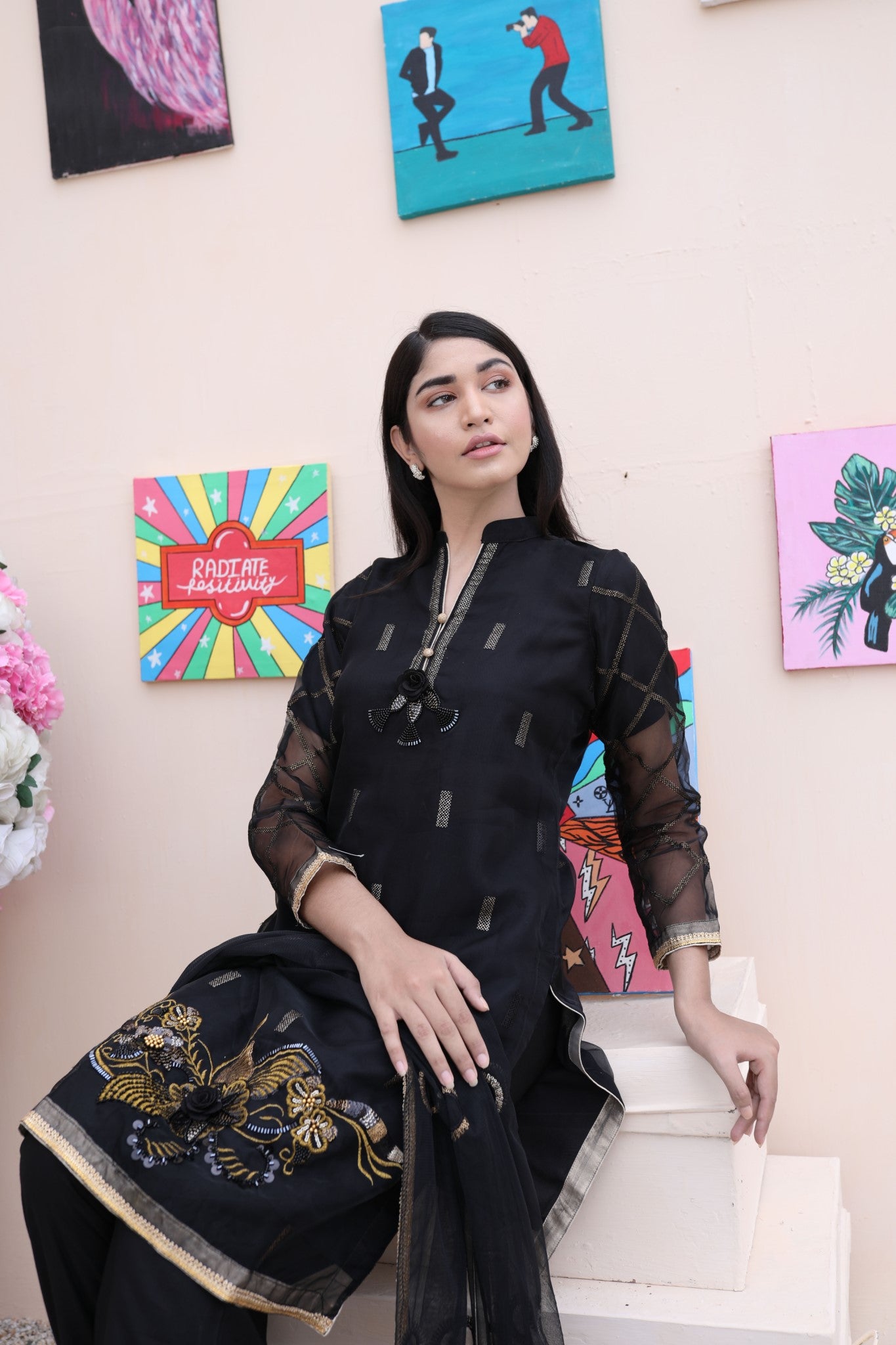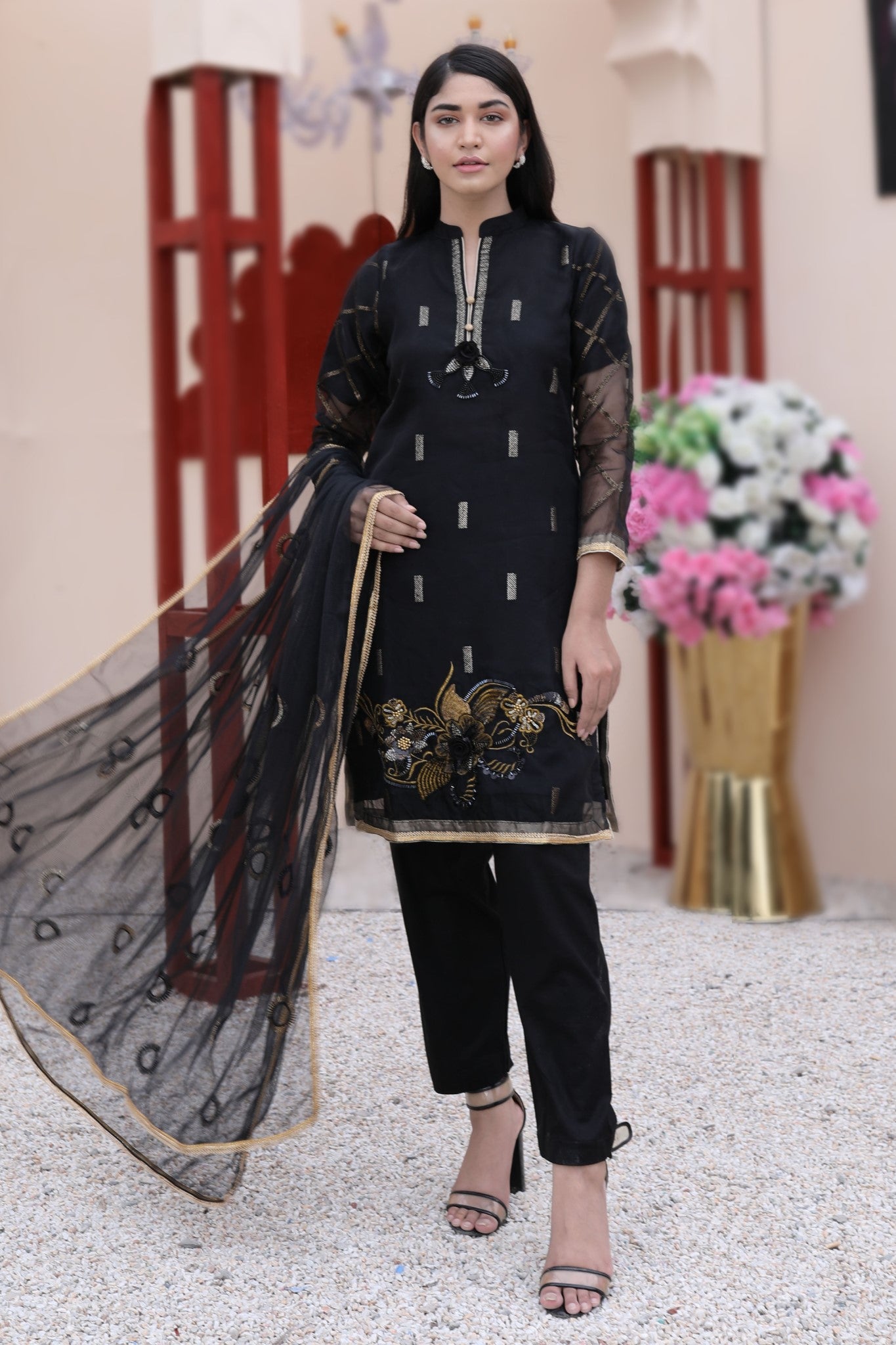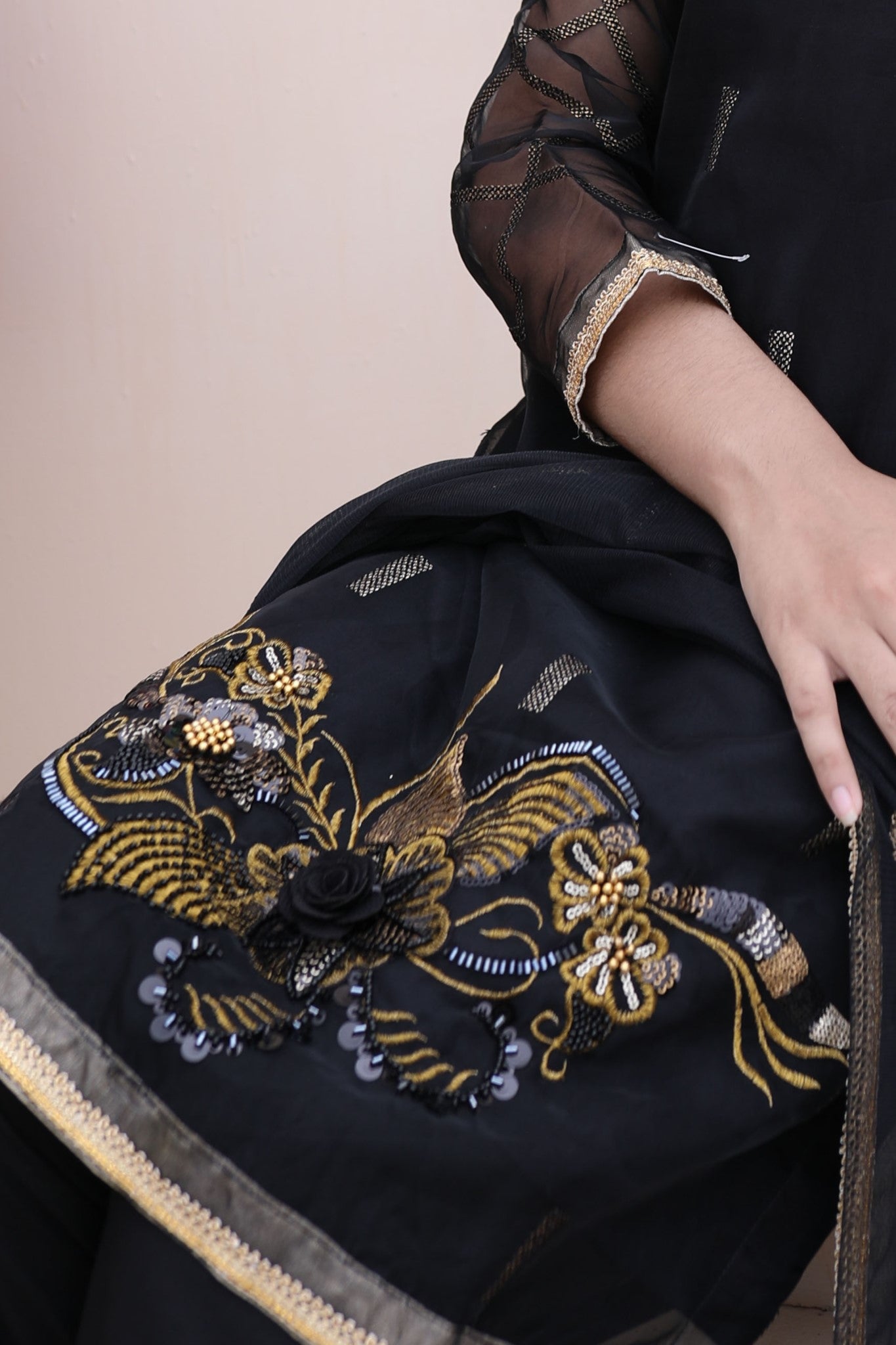 Embroidered and machine embellished organza semi formal silhouettes, Attire with sequenced embellished RTW dupatta paired with grip trousers ……