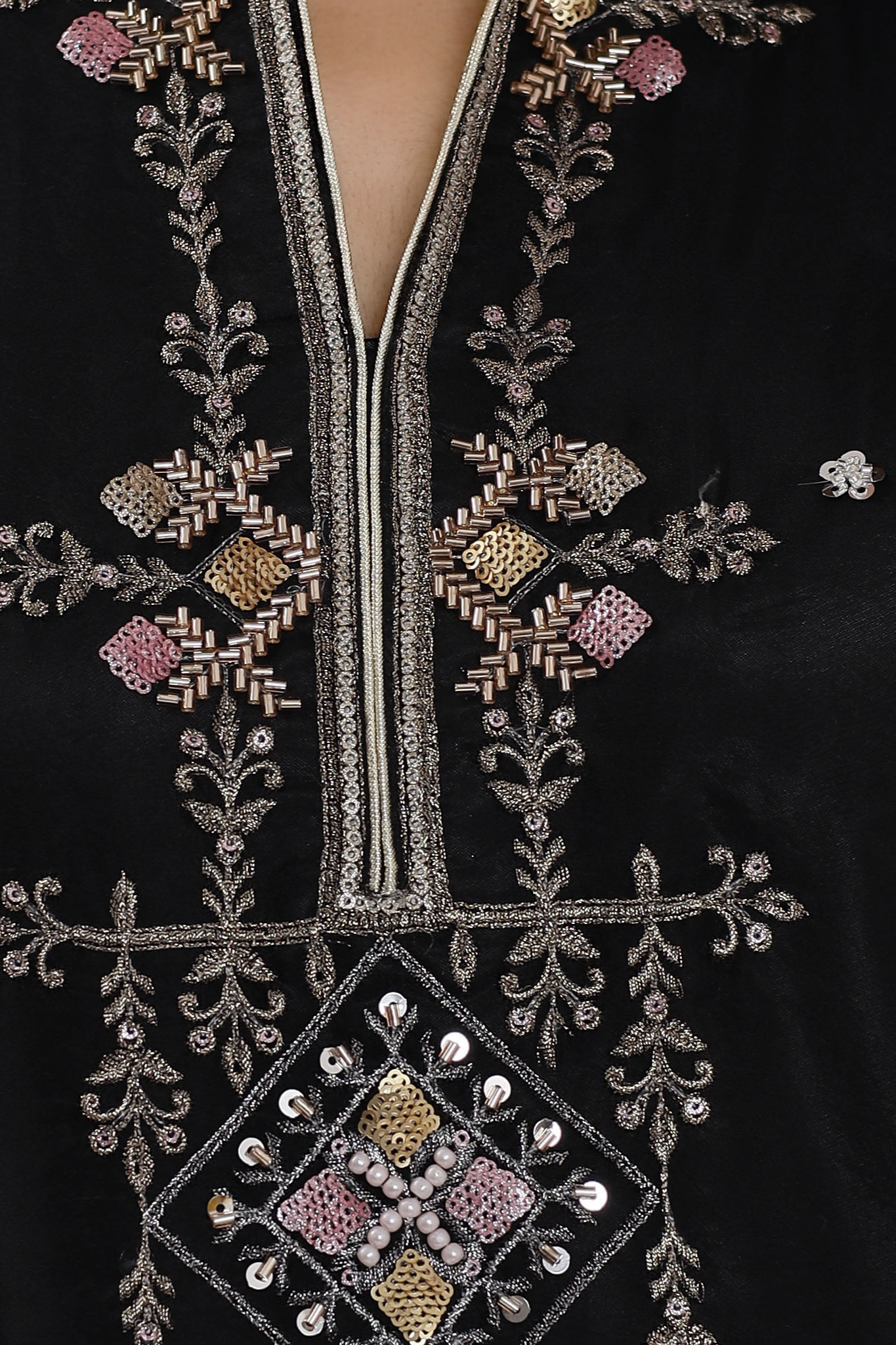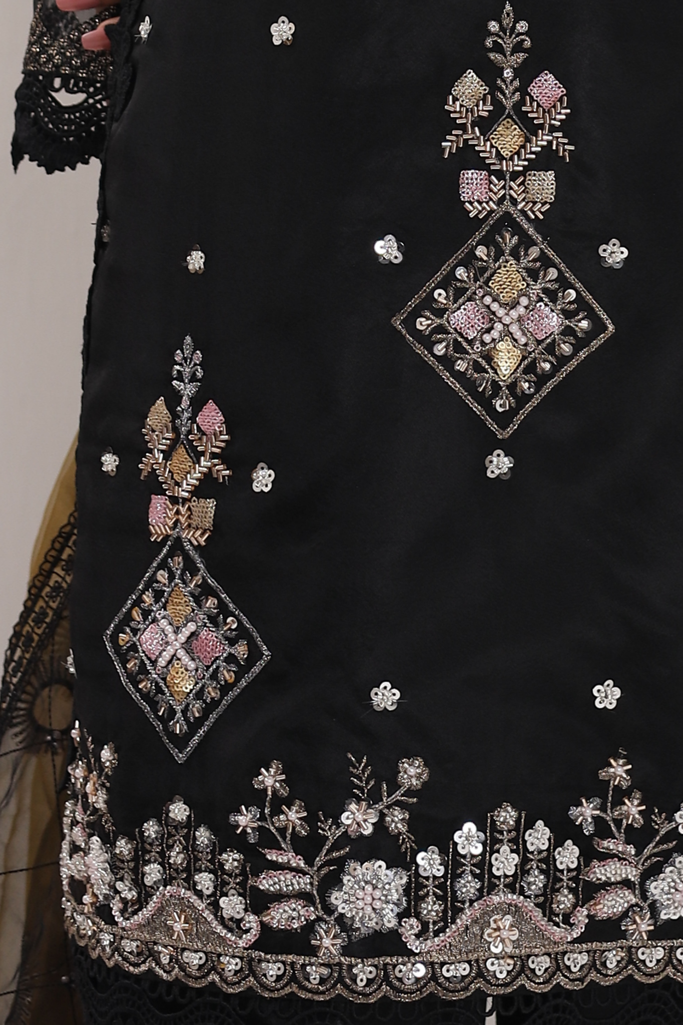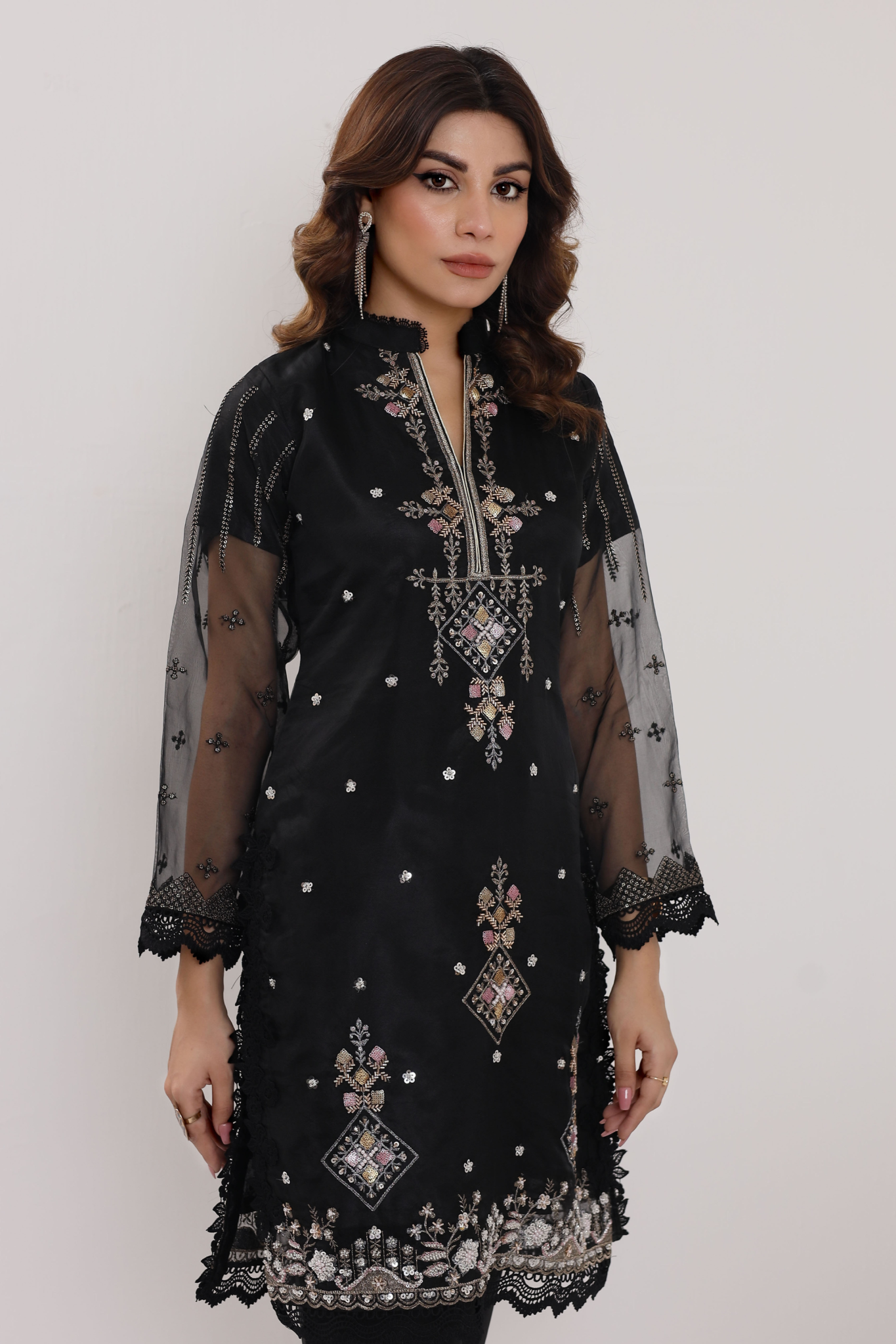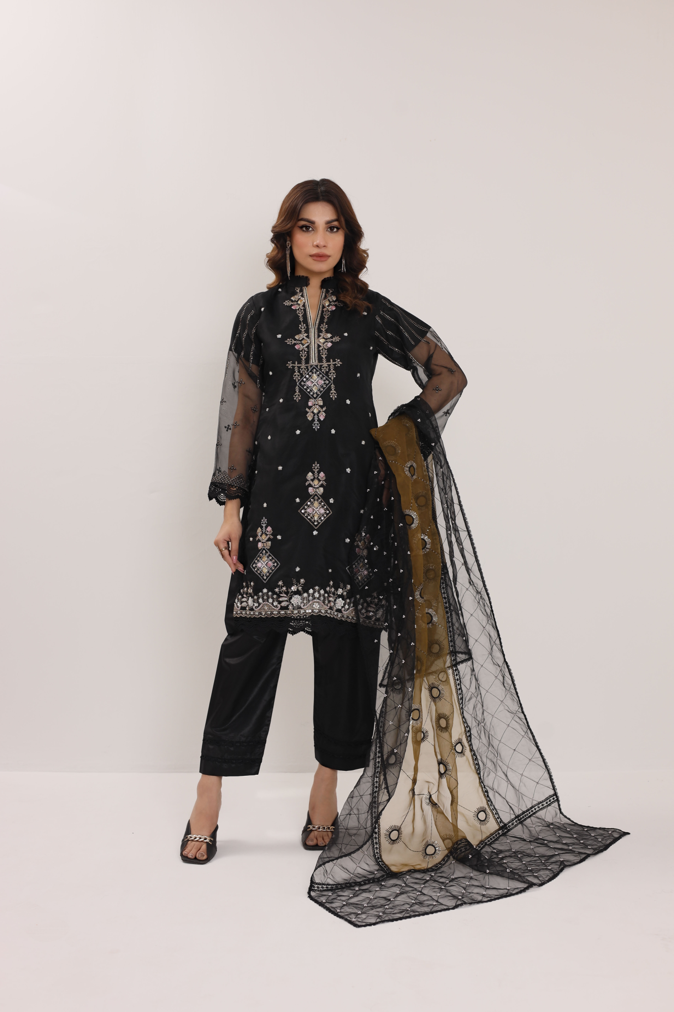 Elevate your style with Machine Embellishments/ Embroideries in our jade-black Organza attire with intricate ensemble in RTW sequins net Dupatta. Accents the entire luxe Silhouette.
