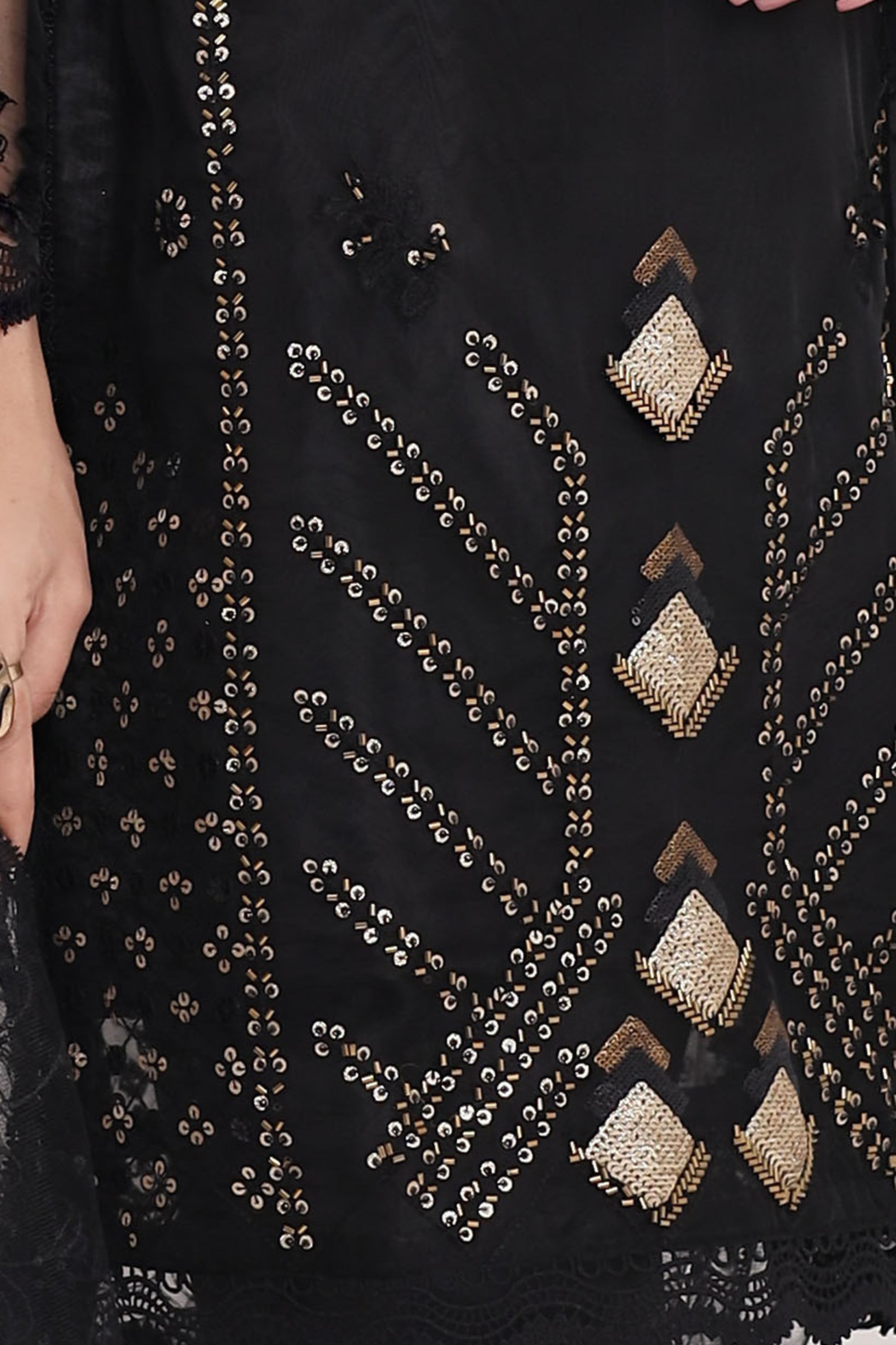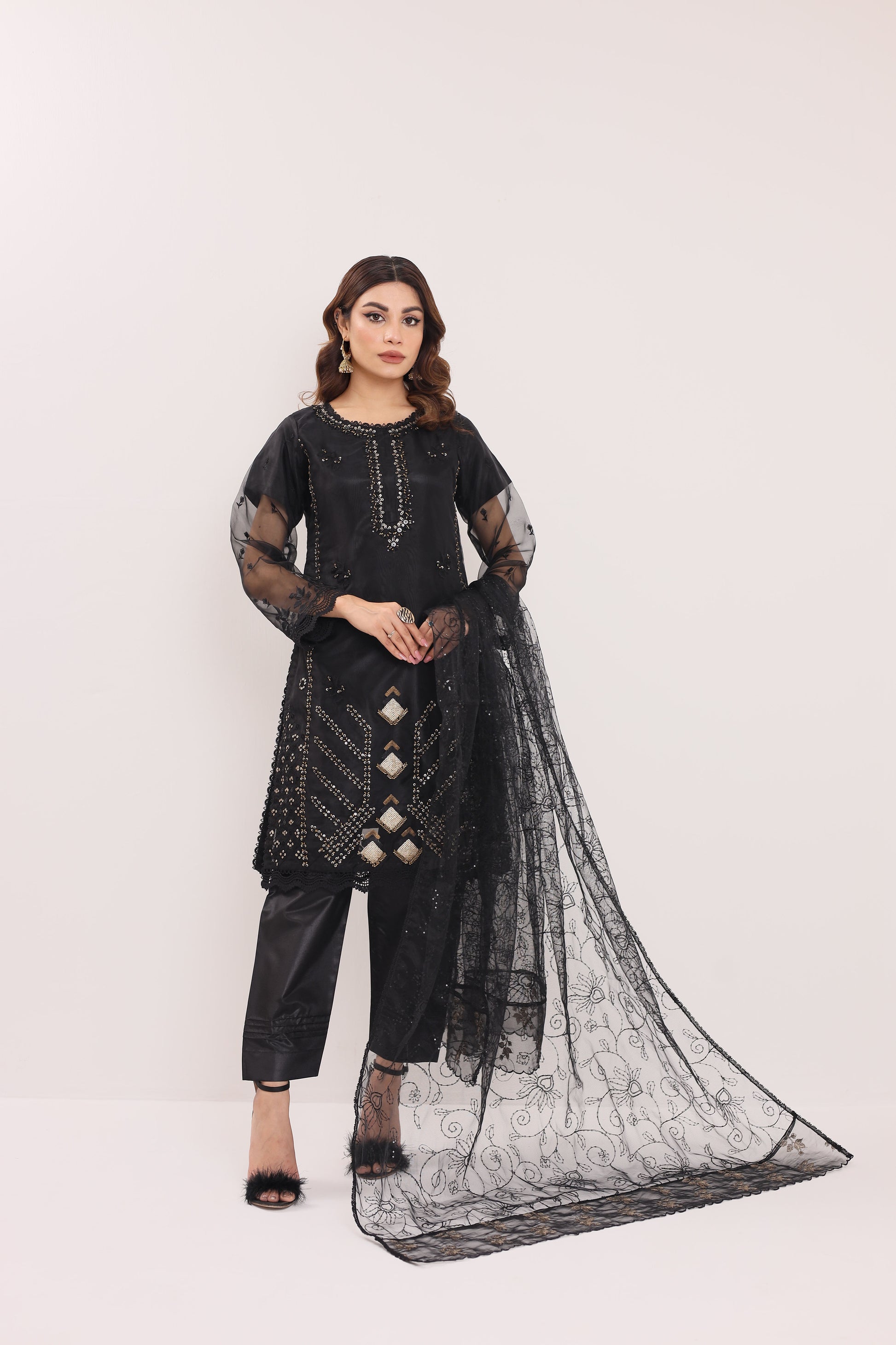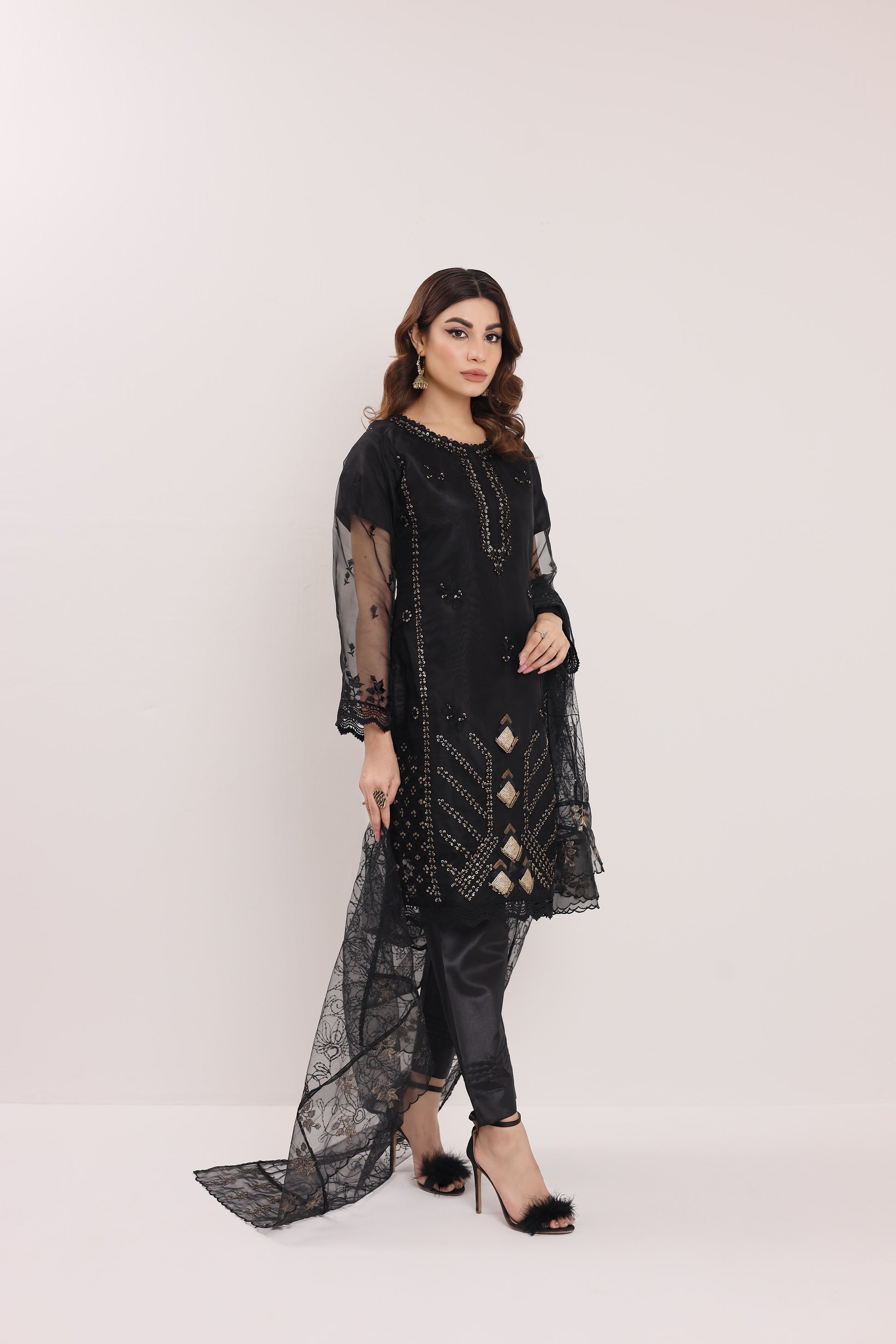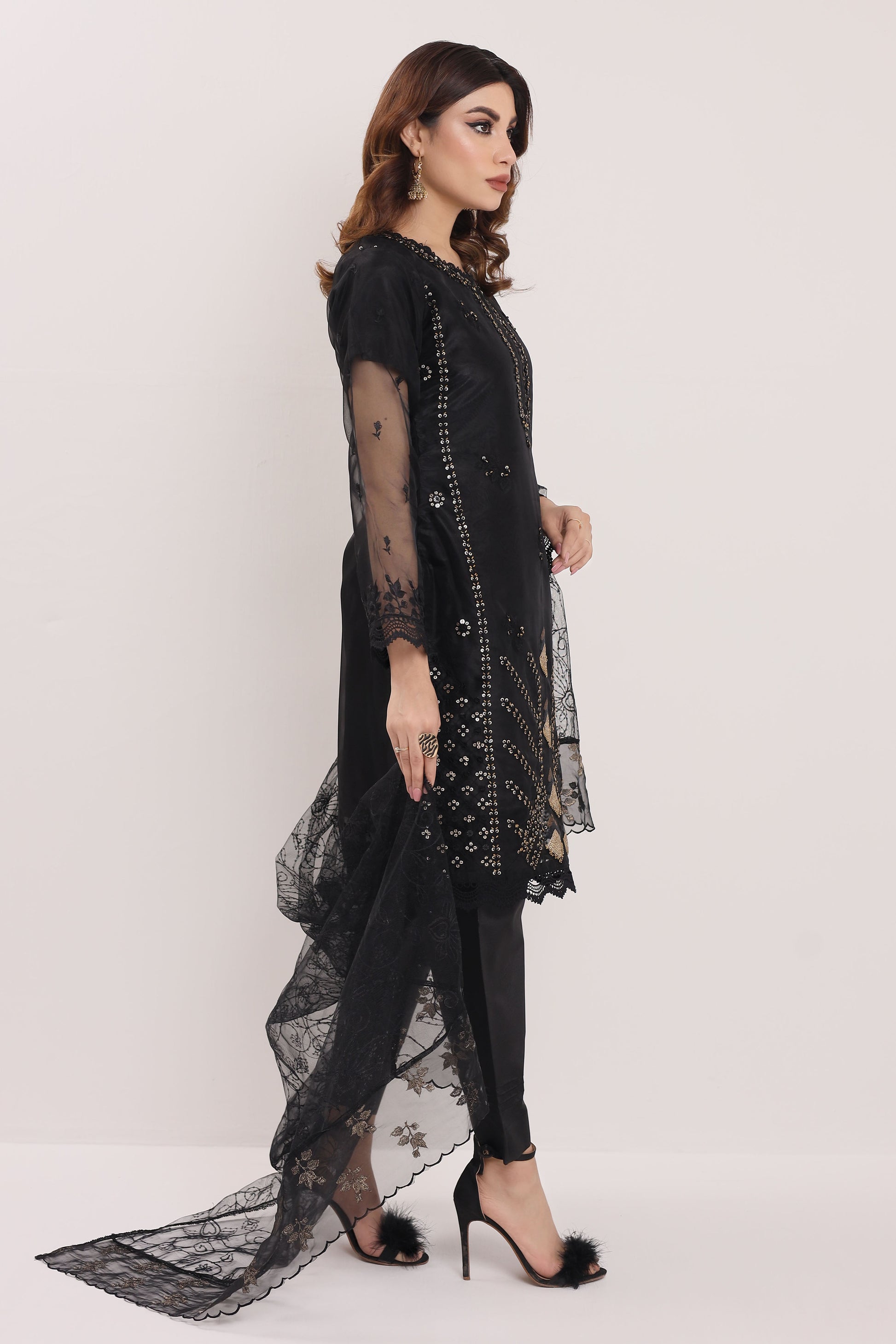 Elevate your style with Machine Embellishments/ Embroideries in our pure black Organza attire with intricate ensemble in sequins net Dupatta. Accents the entire luxe Silhouette.