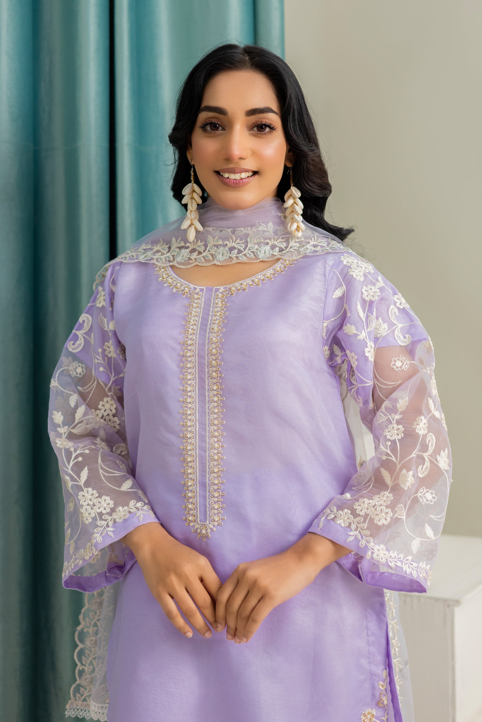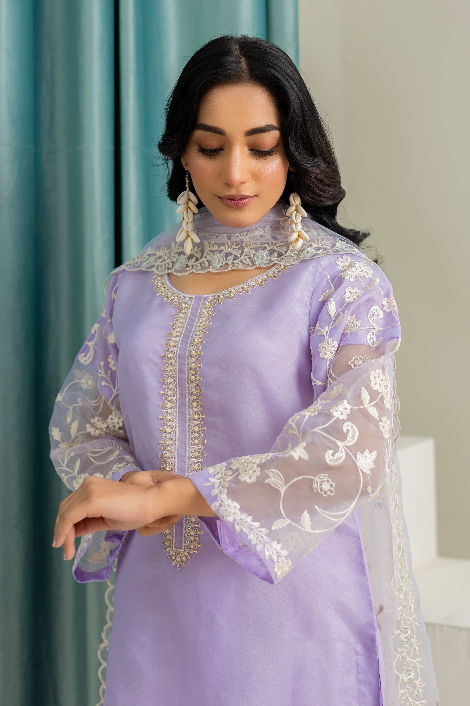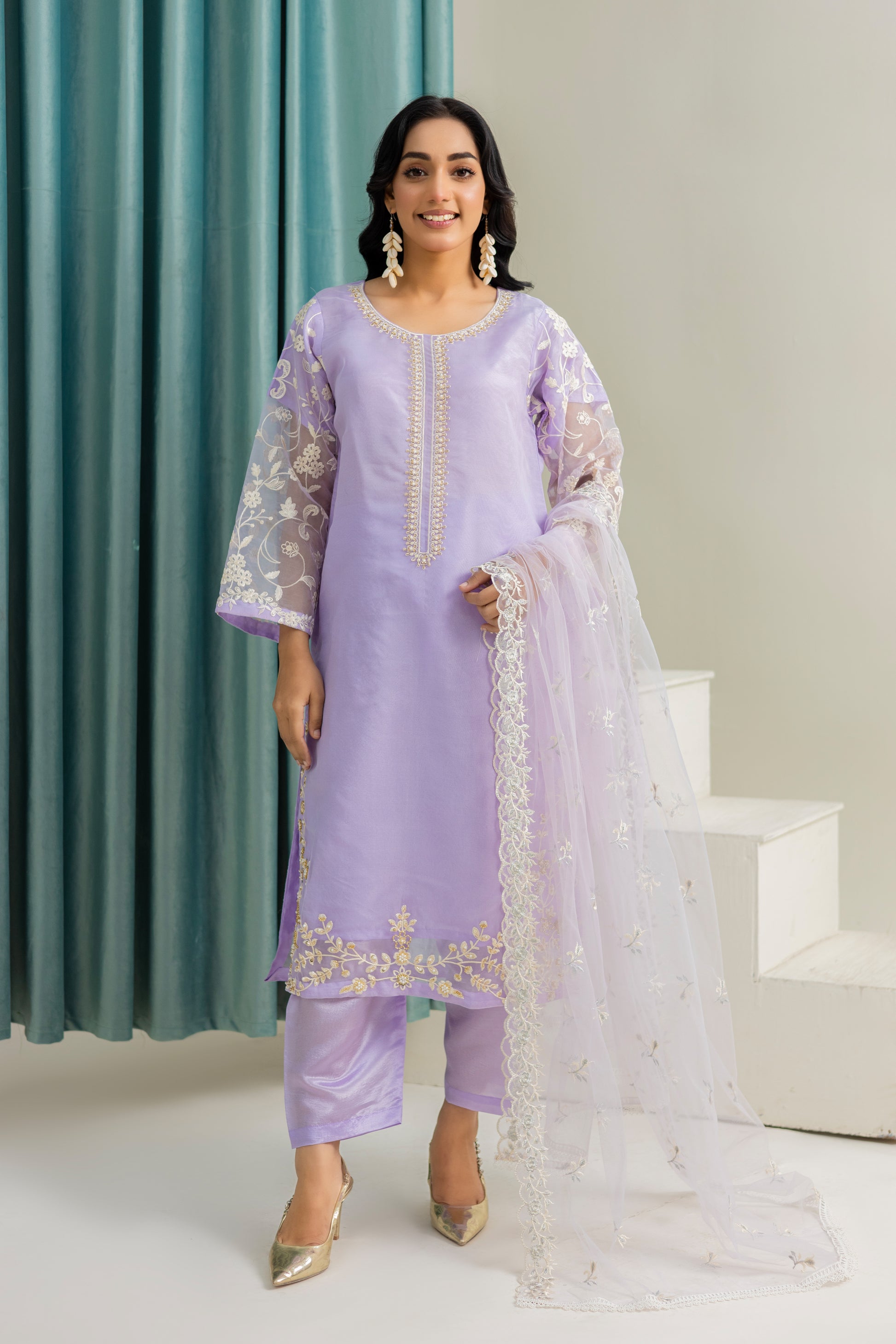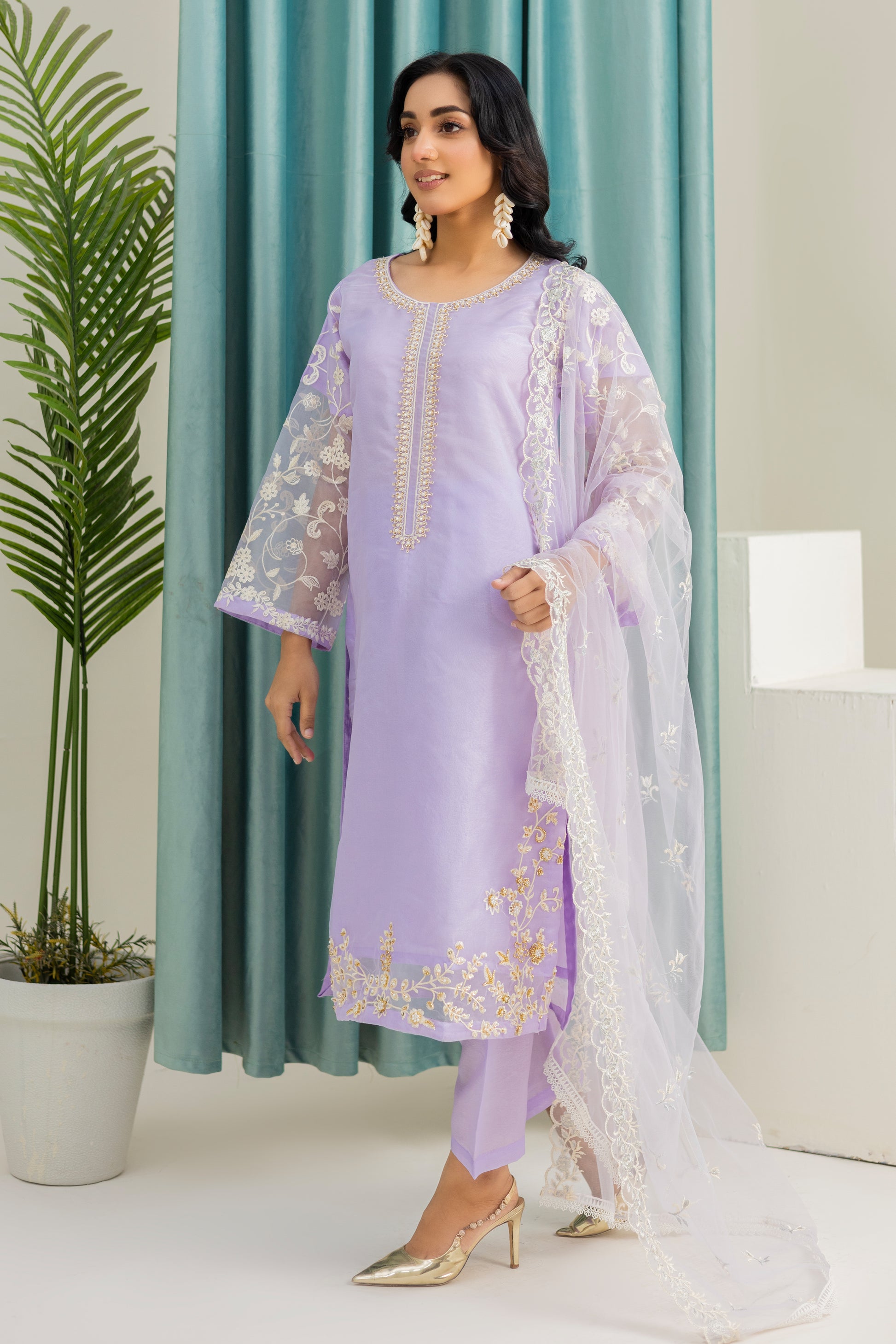 This elegant outfit features exquisite embroidery on the neck and daman, complemented by the dyed bottom for a perfect evening look. The embroidered sleeves add a touch of sophistication, while the included duppata completes the ensemble. Ideal for a night out, this outfit is sure to make you stand out in style.