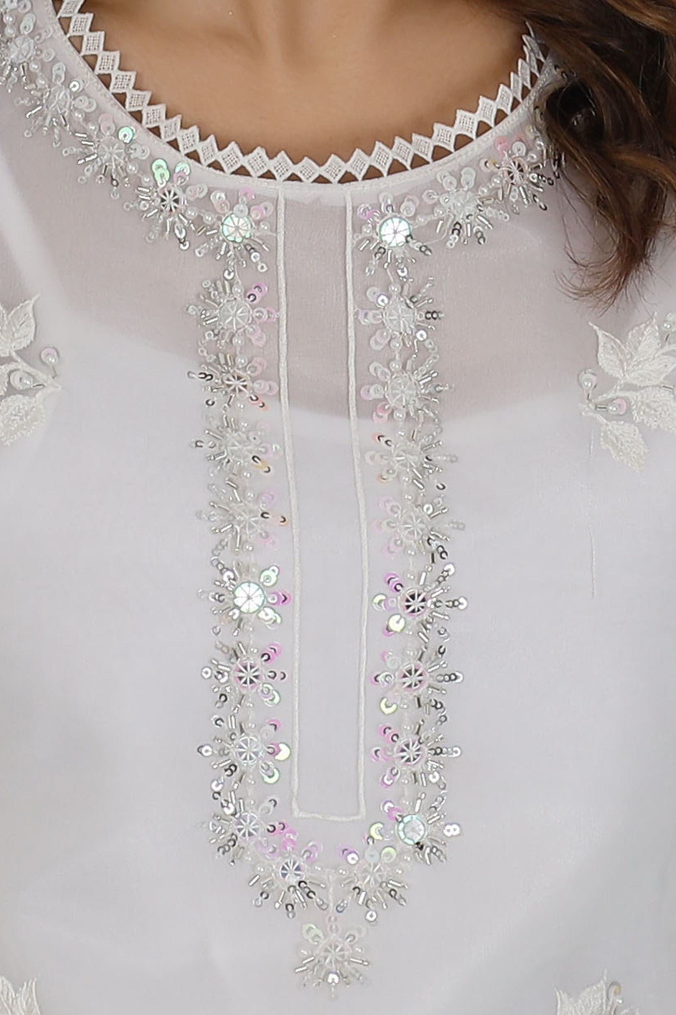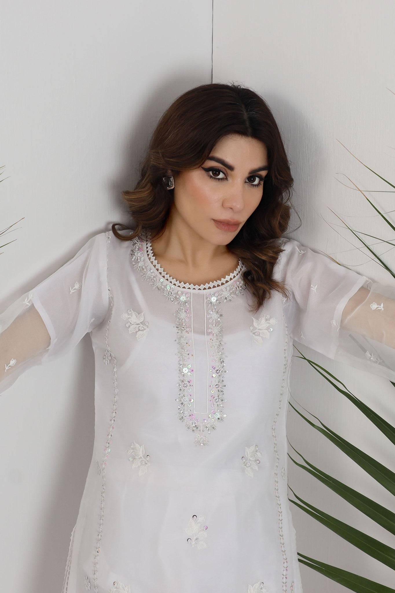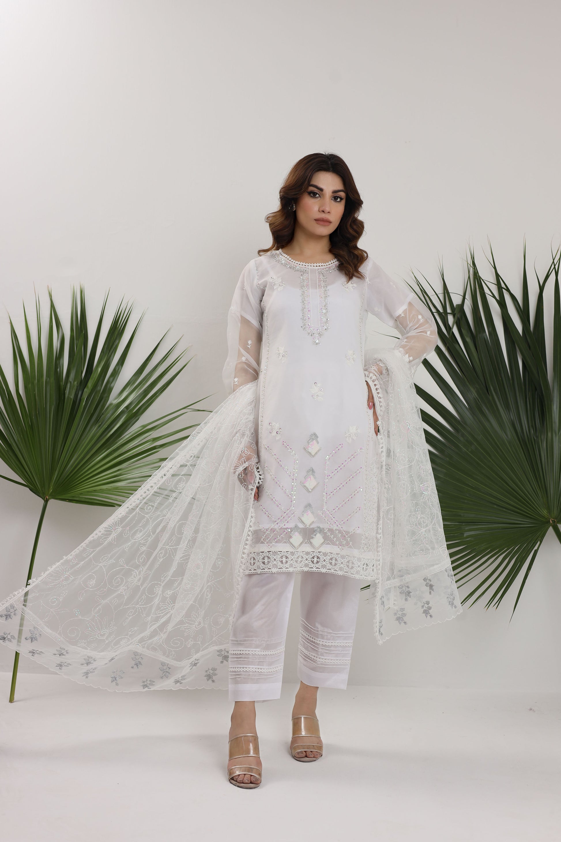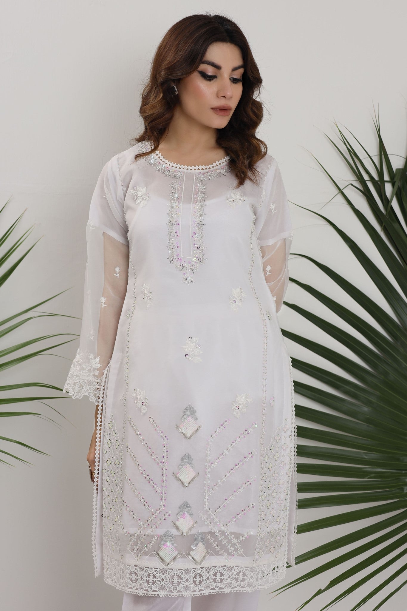 Elevate your style with Machine Embellishments/ Embroideries in our pure black Organza attire with intricate ensemble in sequins net Dupatta. Accents the entire luxe Silhouette.